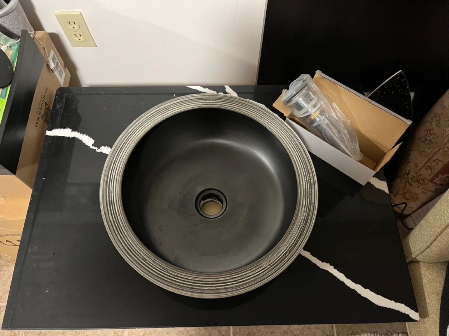 This is a stylish black vessel sink with a unique ribbed exterior. It includes a chrome faucet and mounting hardware. Perfect for a modern bathroom renovation!