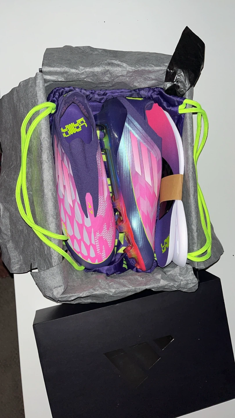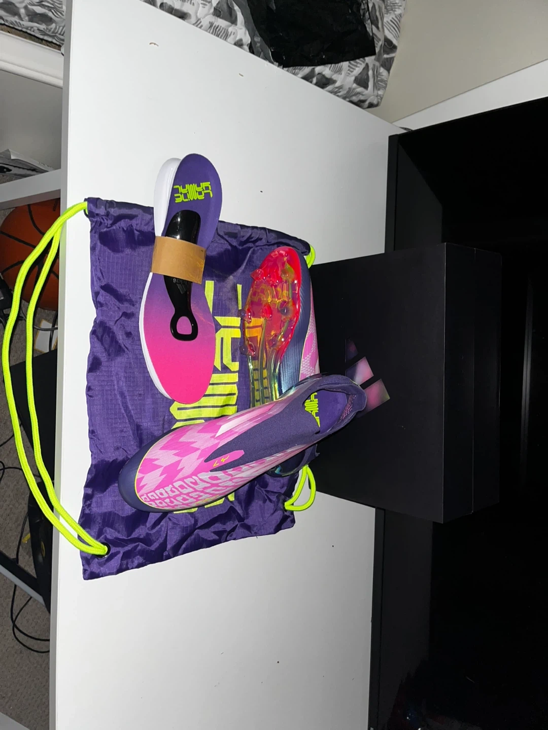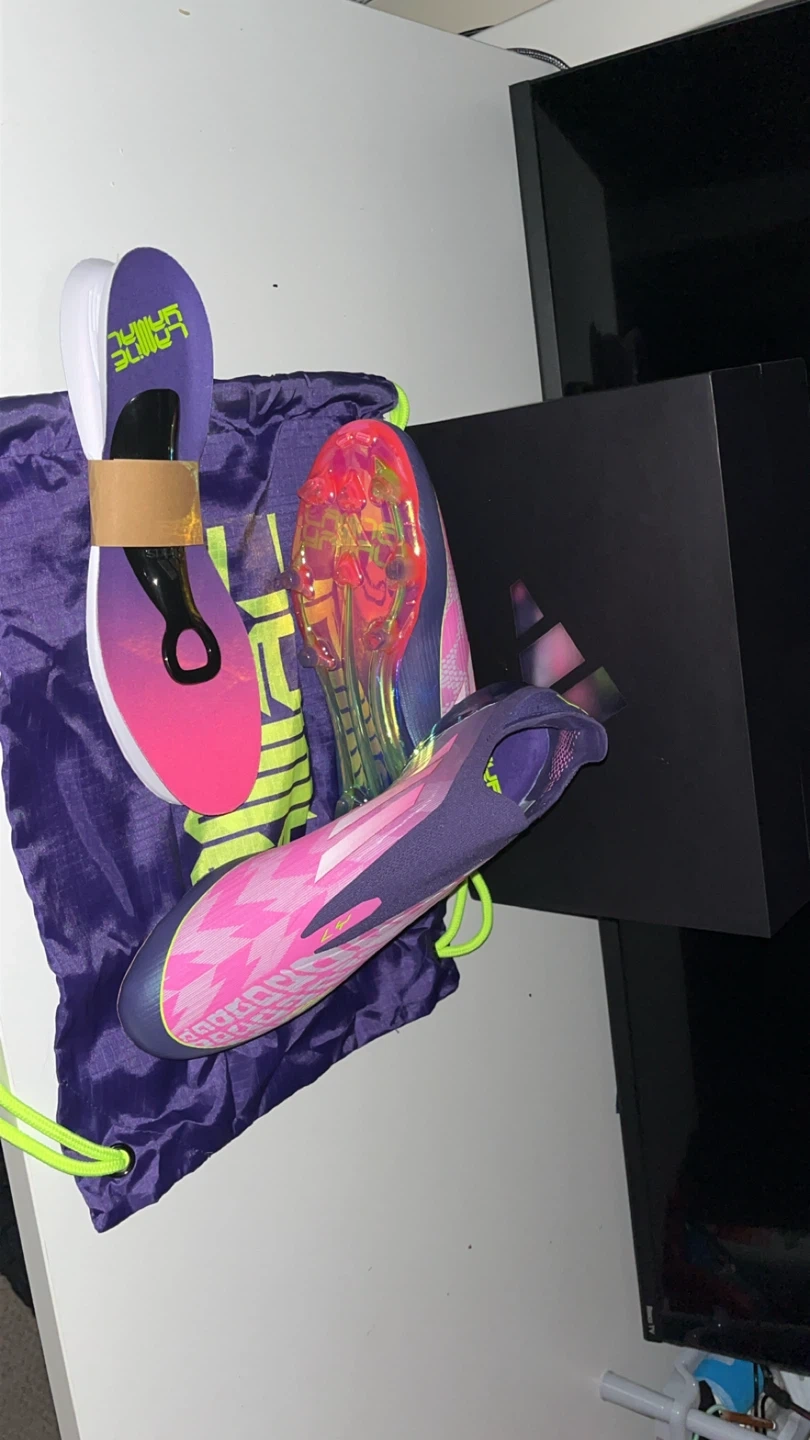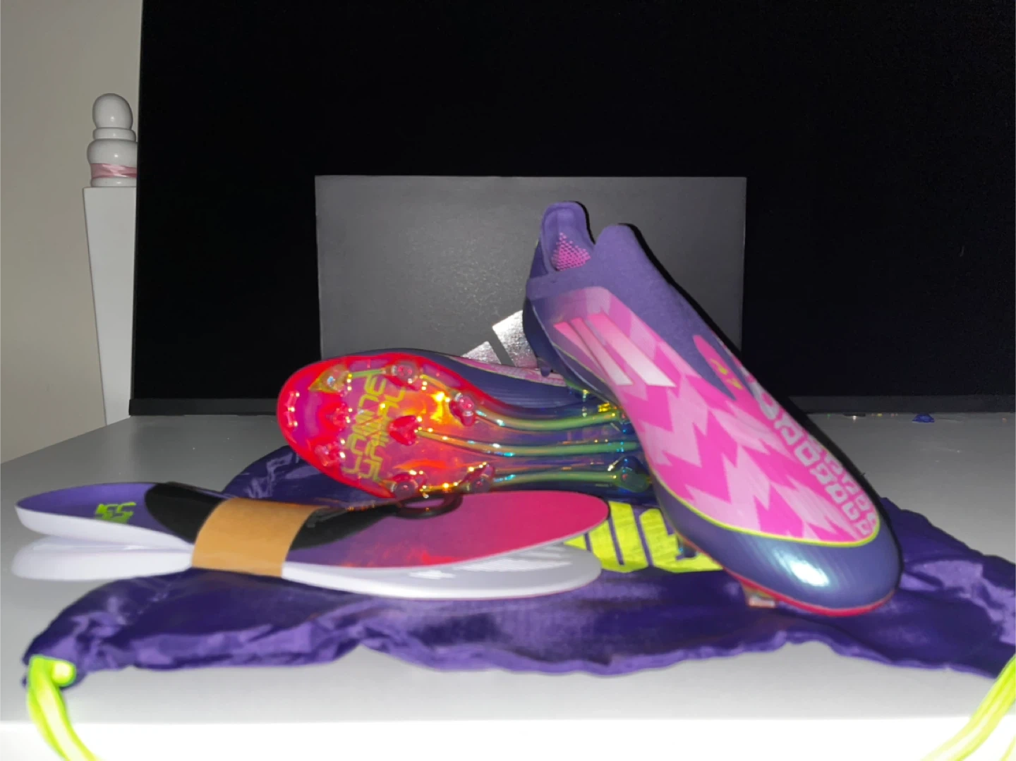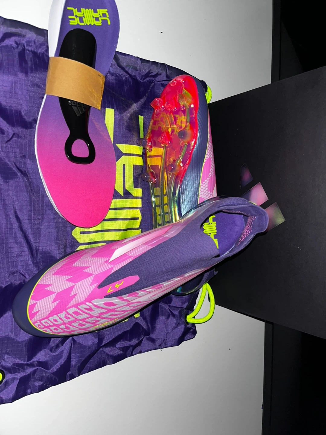 These Adidas X Speedportal.1 FG soccer cleats come in a vibrant purple, pink, and blue gradient. They feature a lightweight design for speed and agility on firm ground. The cleats include a drawstring bag and original packaging.