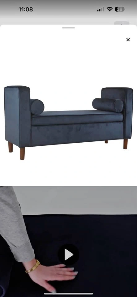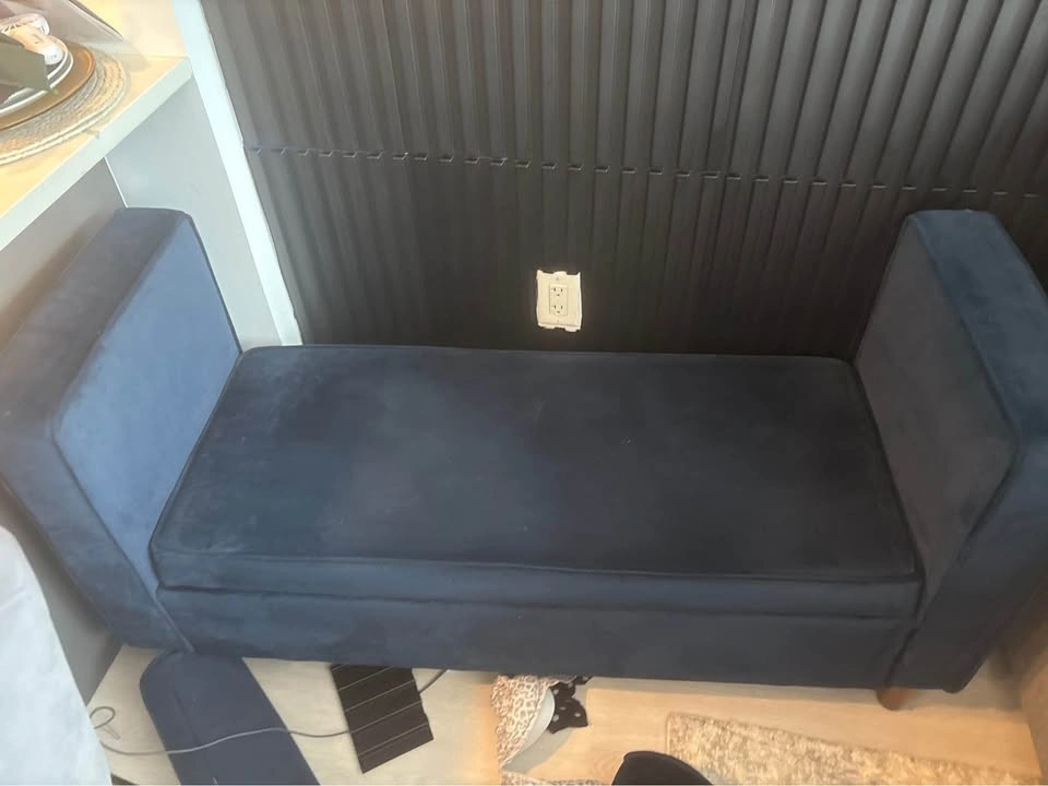George Oliver Wittrock velvet upholstered storage bench from Wayfair in dark navy. Features flip-top hidden storage and solid wood legs. In great condition — clean, no rips, stains, or damage. Has all pieces it came with. Perfect for an entryway, bedroom, or living space. Priced to sell. Need gone by end of week!