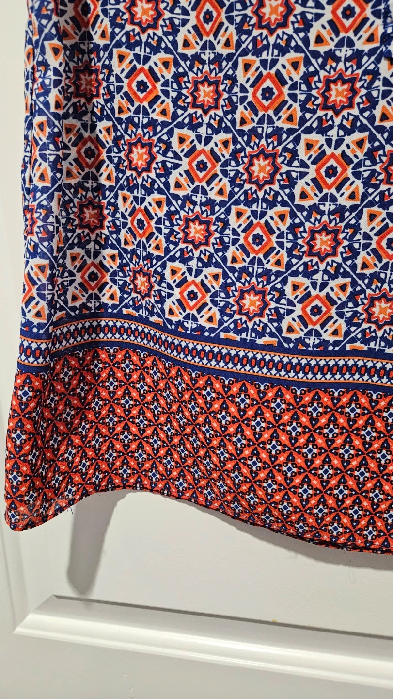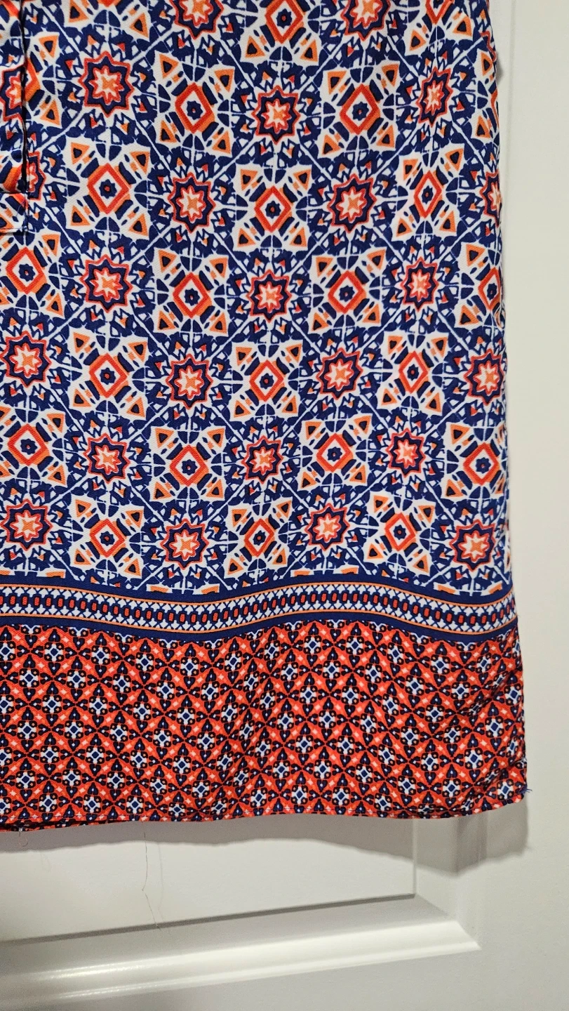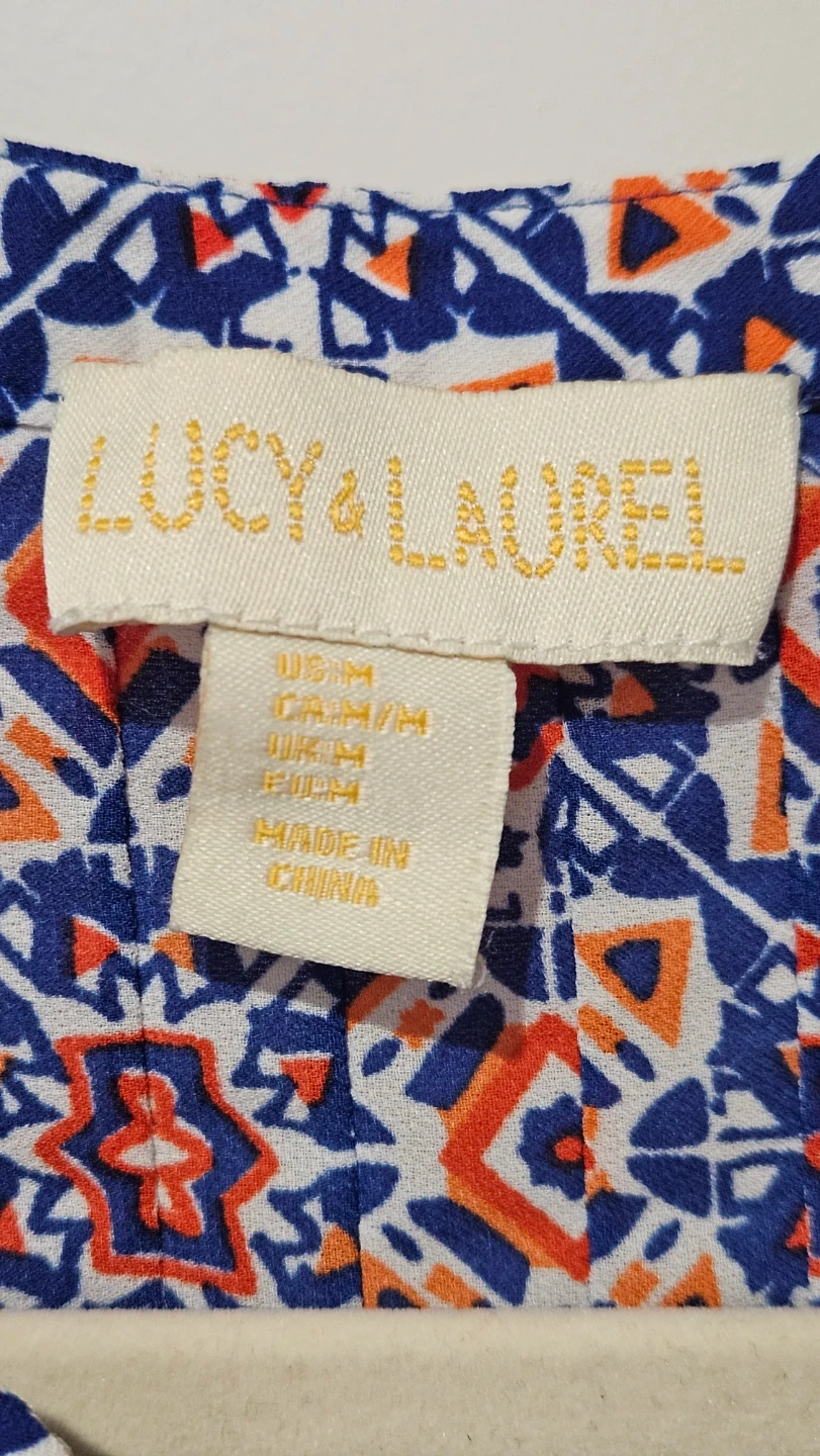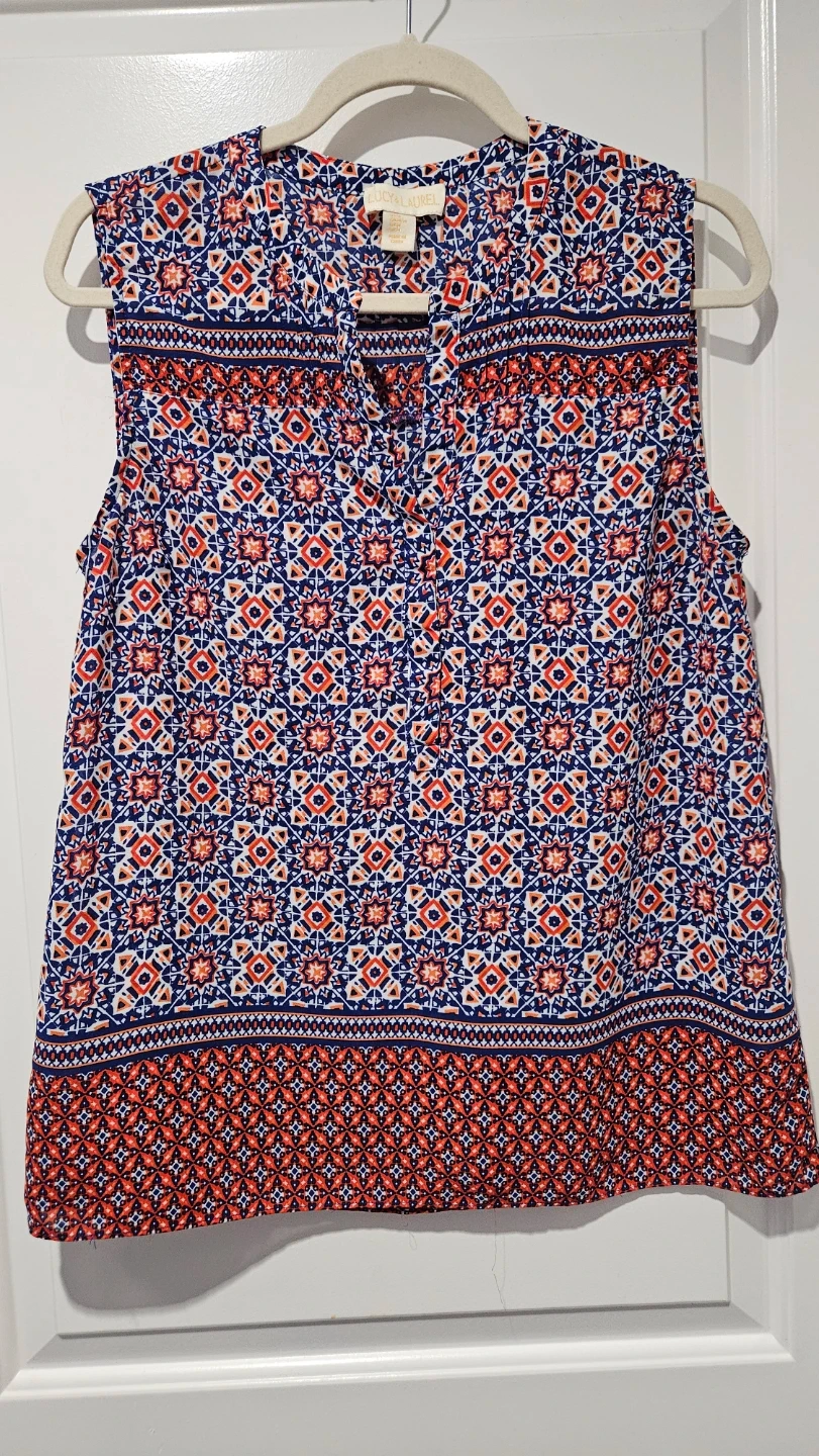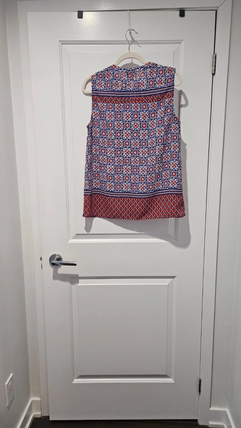 Virtually brand new Lucy & Laurel sleeveless blouse. It features a colourful blue, red, and white geometric print. The material is lightweight and perfect for summer, spring days, and professional wardrobe - office, business casual, evening or everyday wear.