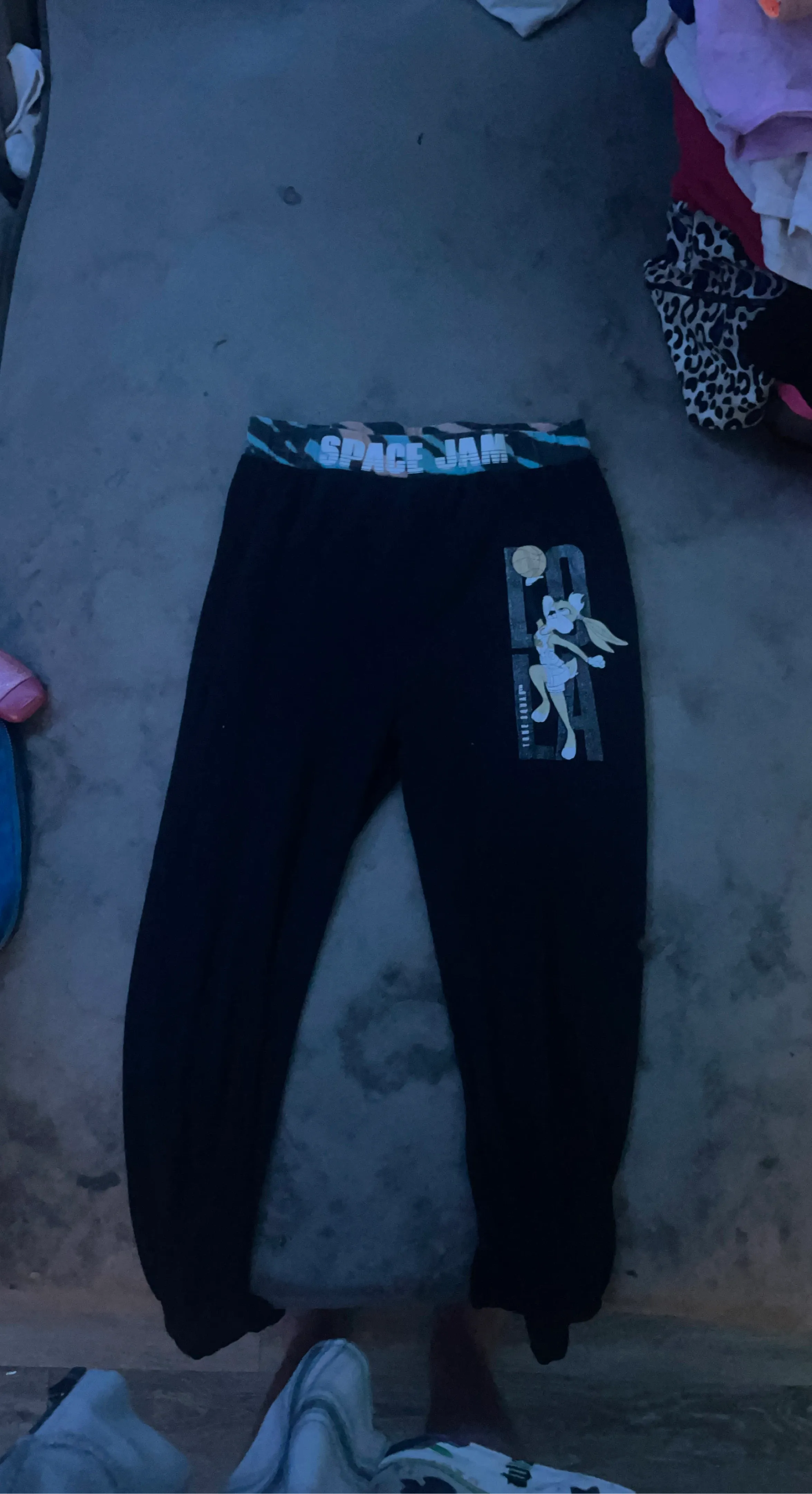 Black joggers featuring a colourful 'Space Jam' waistband and a Lola Bunny graphic on the leg. Made for comfort and style. These are perfect for lounging or casual wear!