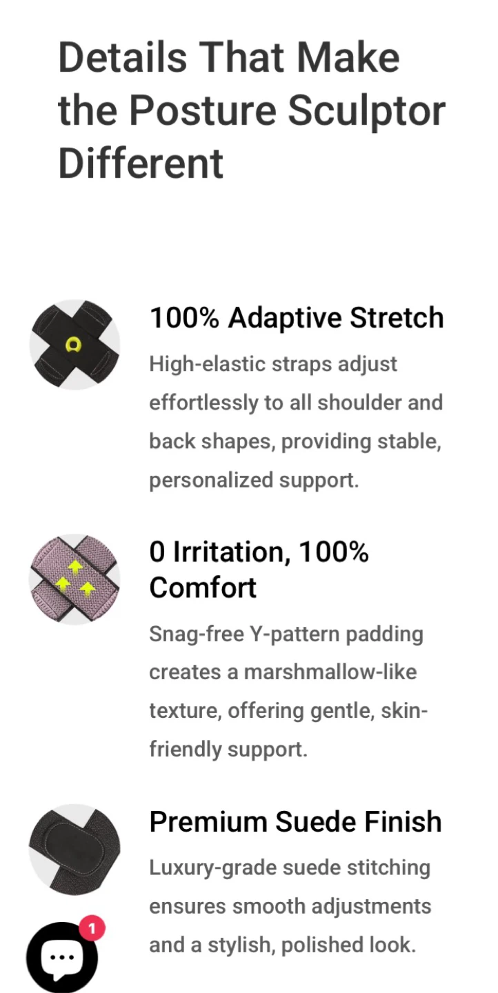 This AOFIT Invisi-Posture Sculptor is designed with adaptive stretch, using high-elastic straps to adjust to your shoulder and back shapes, providing stable, personalized support. The snag-free Y-pattern padding creates a marshmallow-like texture for gentle, skin-friendly support. It also has a premium suede finish for smooth adjustments and a stylish look! The advanced chest-lifting design subtly adjusts chest alignment, offering a 15% improvement in chest projection compared to standard posture correctors
