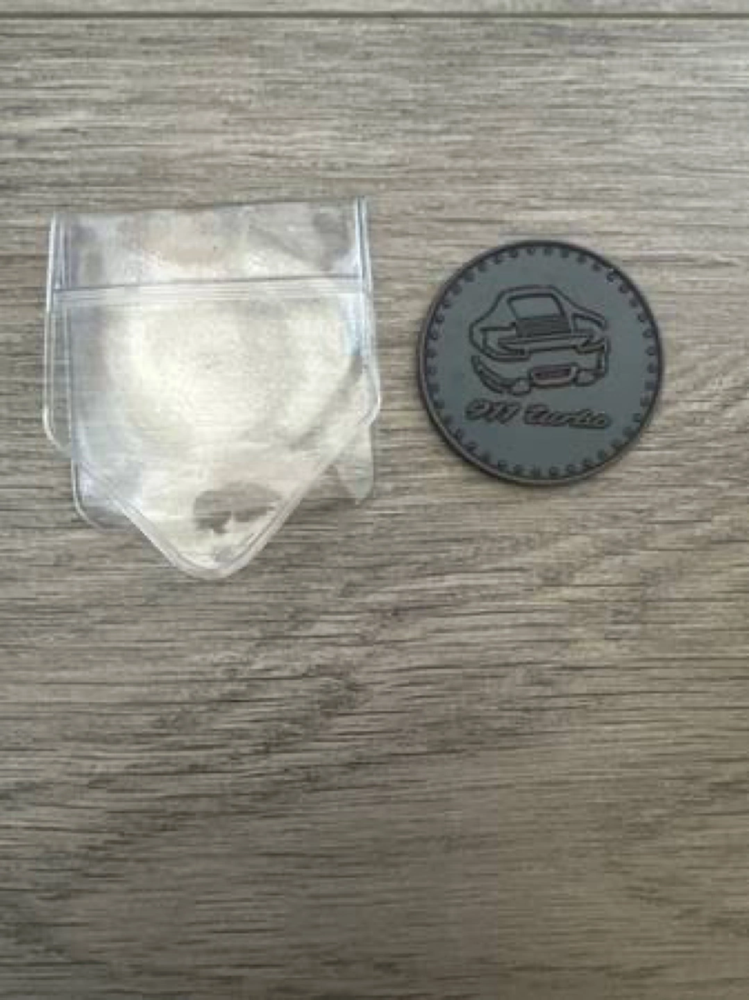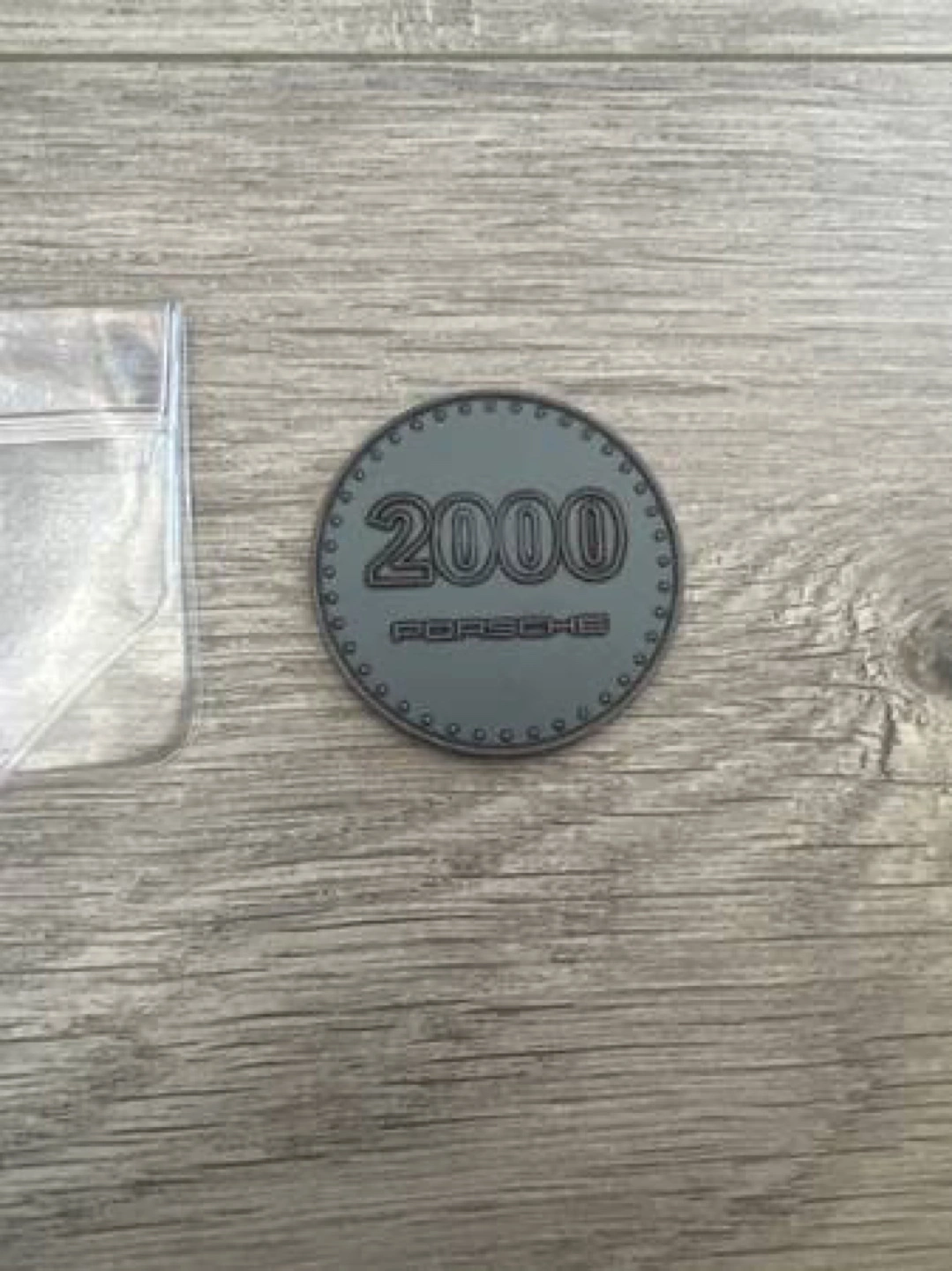 Collectible Porsche coin. Features 911 Turbo design. Commemorates the year 2000. Dark grey colour. Comes with a plastic protective sleeve.