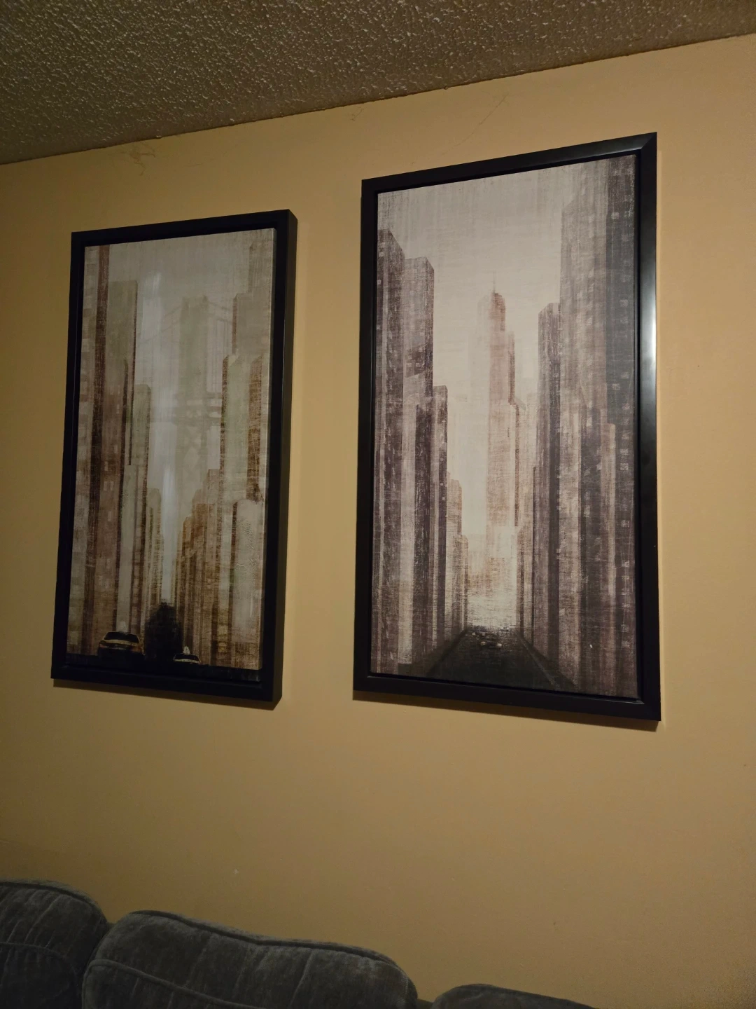 Two framed art prints featuring a modern cityscape. Each piece has a black frame and neutral tones. Perfect for adding a touch of urban style to your living space!