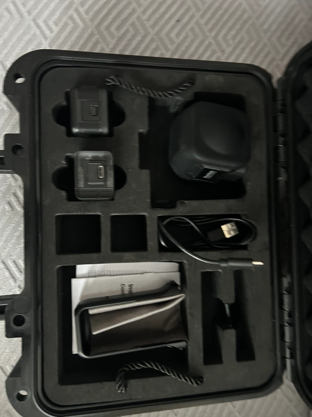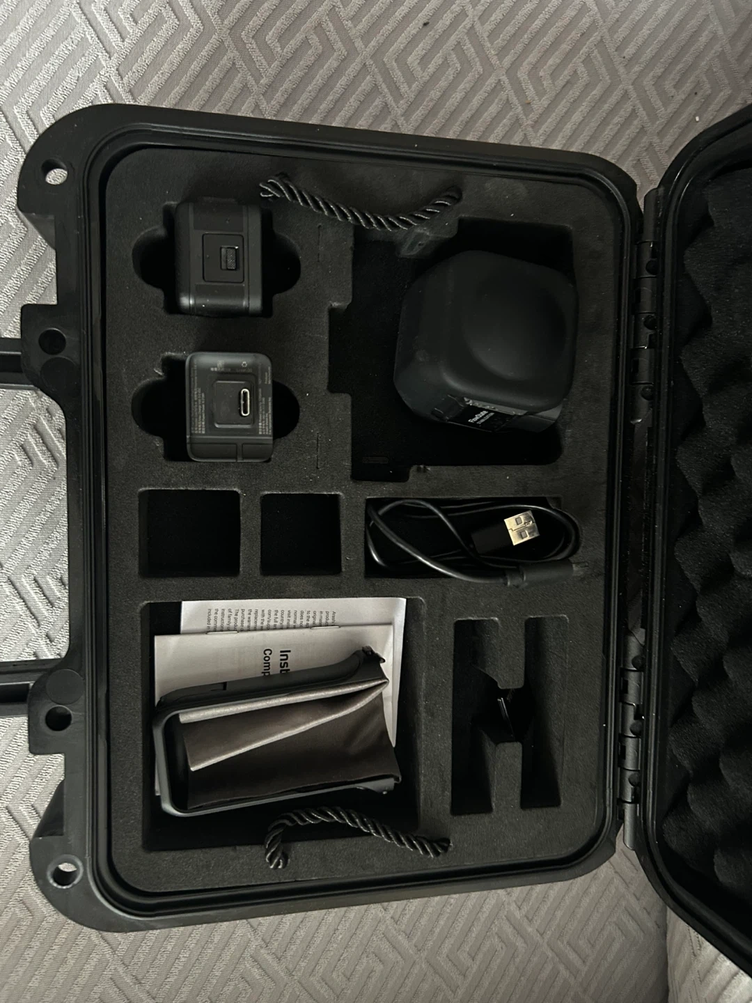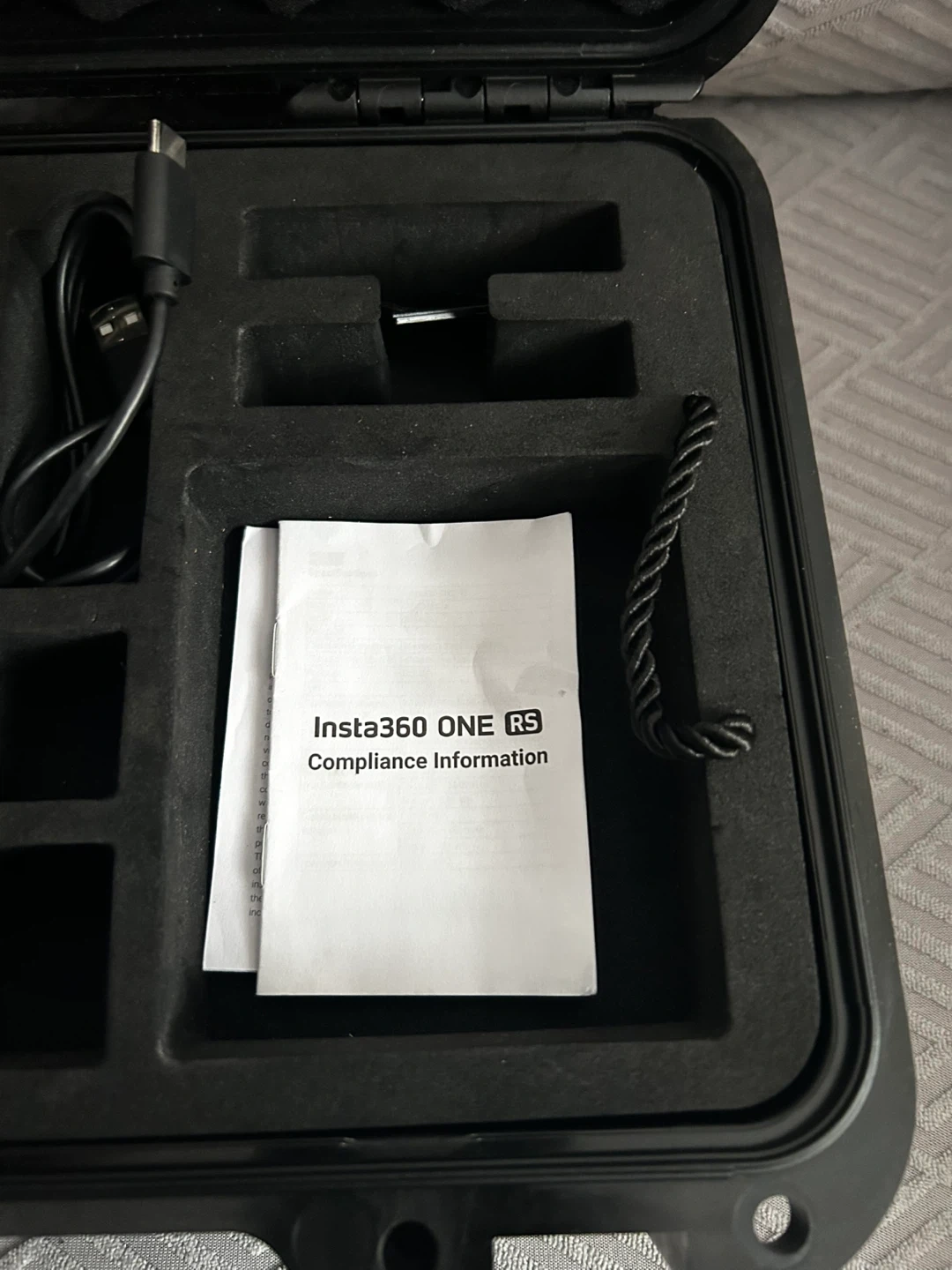 This is the Insta360 ONE RS camera. It includes the main camera body, two additional modules, a charging cable, and a carrying case. It's ready for your next adventure!