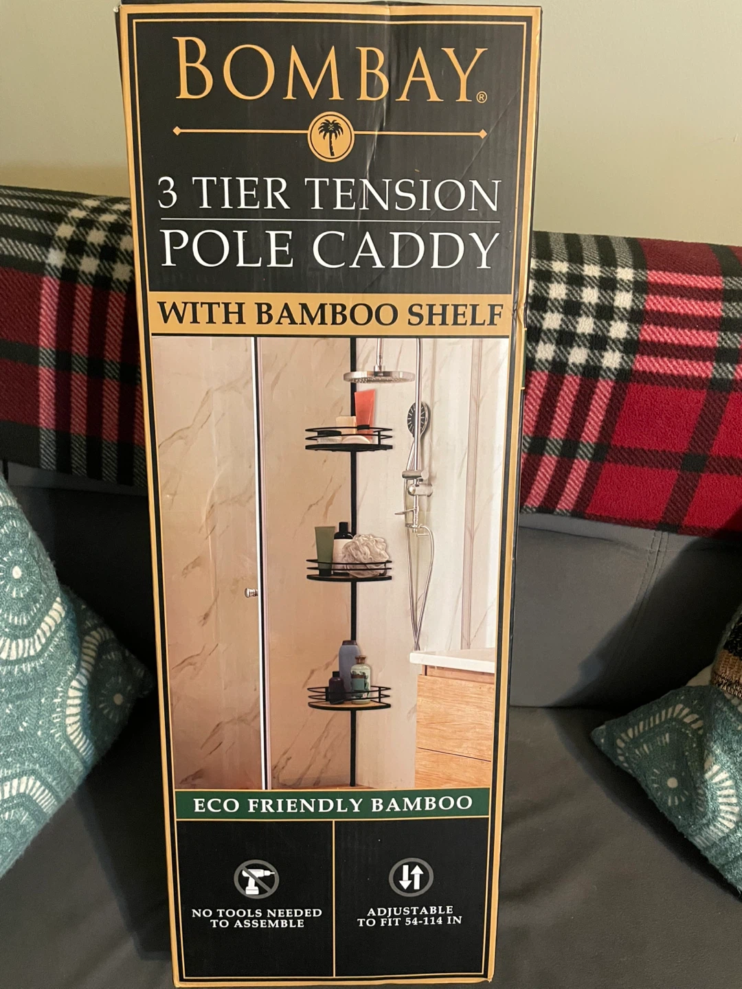 This Bombay 3-tier tension pole caddy features eco-friendly bamboo shelves. It's adjustable to fit 54-114 inches and requires no tools to assemble. This caddy is useful for organizing bathroom essentials.