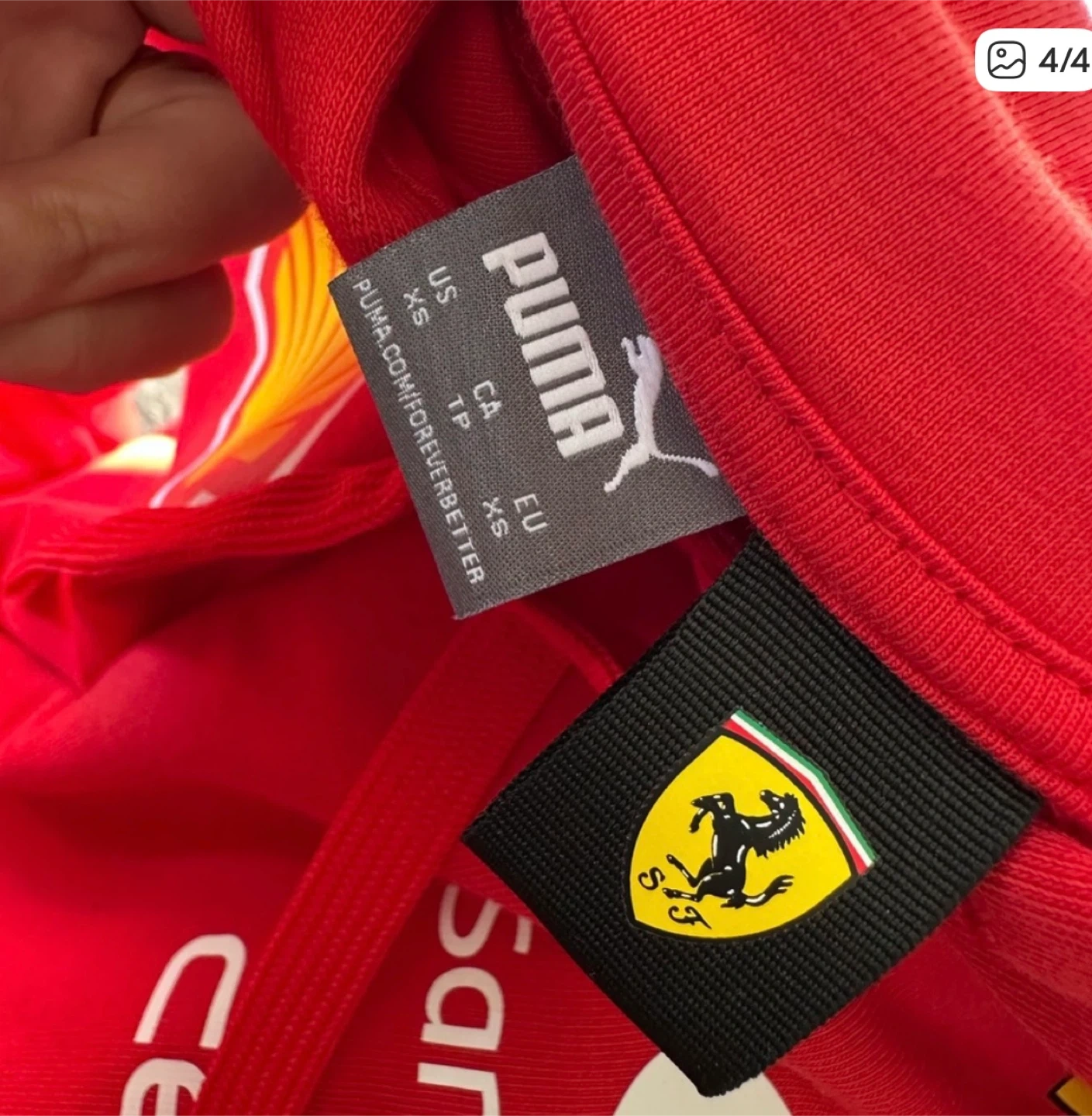 This Puma hoodie is designed for Scuderia Ferrari fans. It's red with yellow accents and features multiple sponsor logos. The size is XS. It's a comfortable and stylish way to show your support for the team!