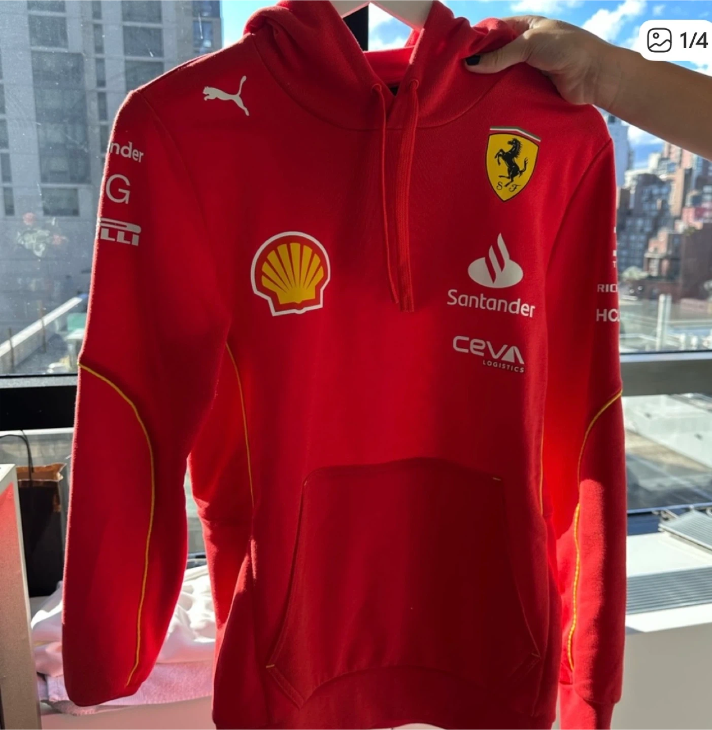 This Puma hoodie is designed for Scuderia Ferrari fans. It's red with yellow accents and features multiple sponsor logos. The size is XS. It's a comfortable and stylish way to show your support for the team!