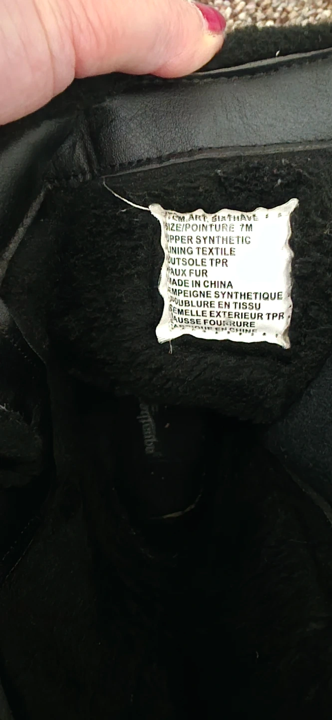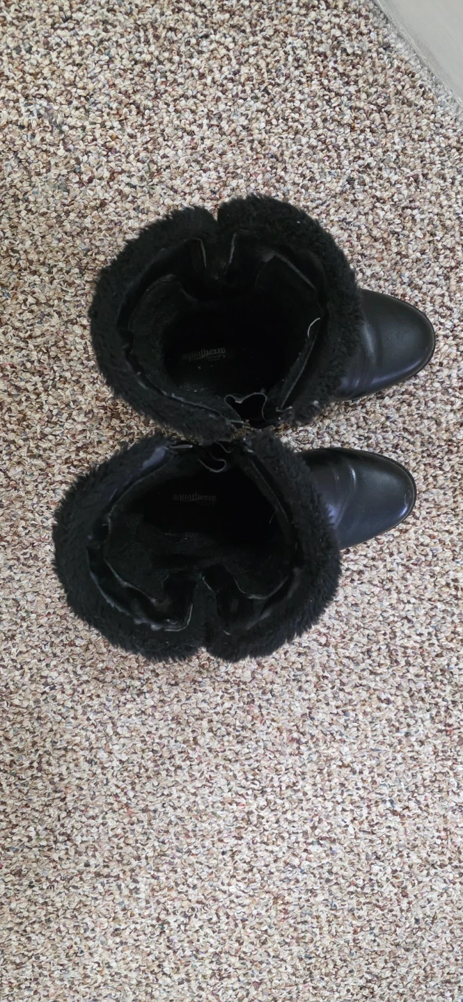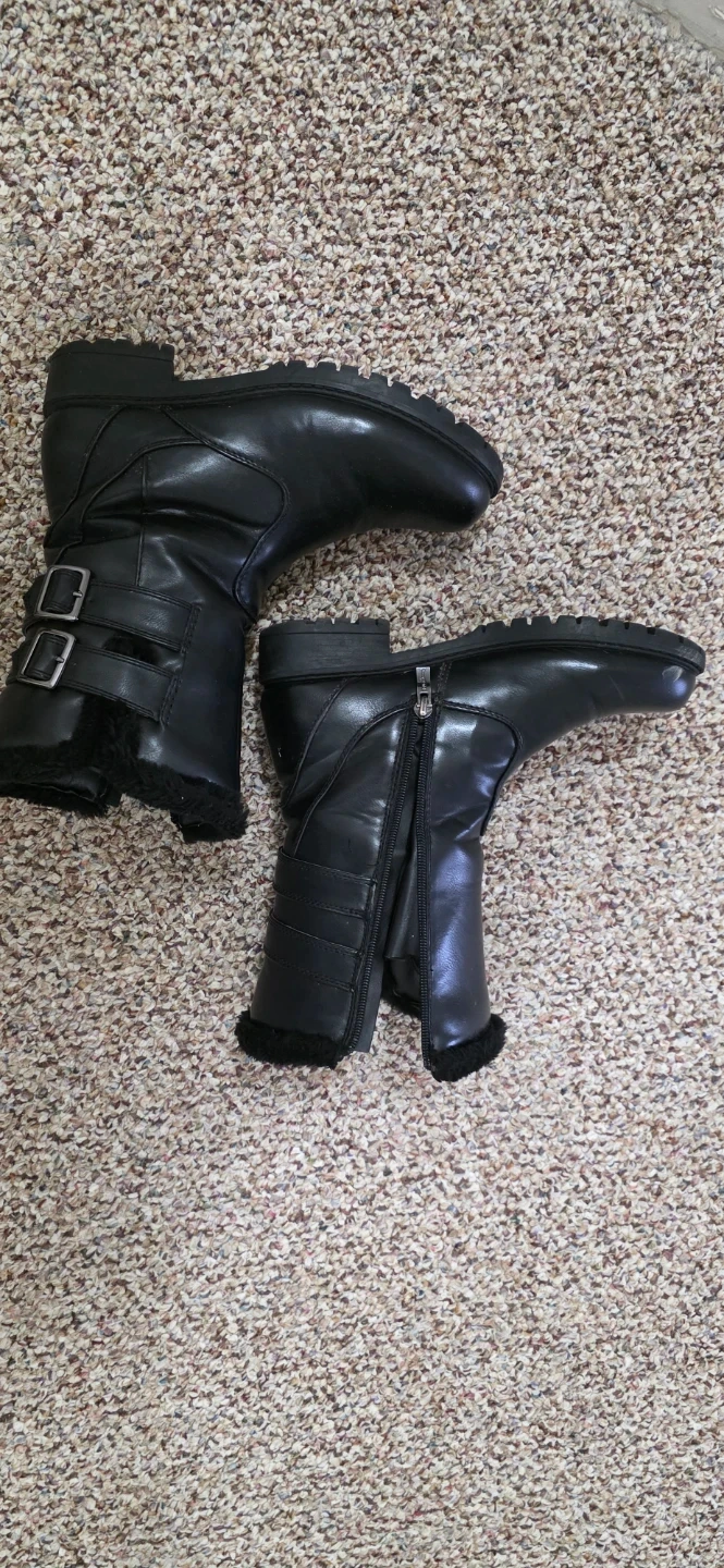 Warm black winter boots with a faux fur lining. These boots feature a side zipper and buckle details for a stylish look. They're made with synthetic uppers and a TPR outsole. Perfect for colder weather!
