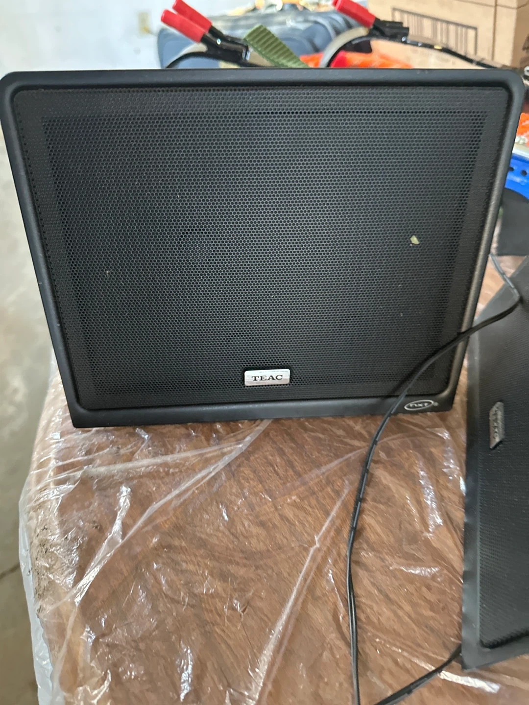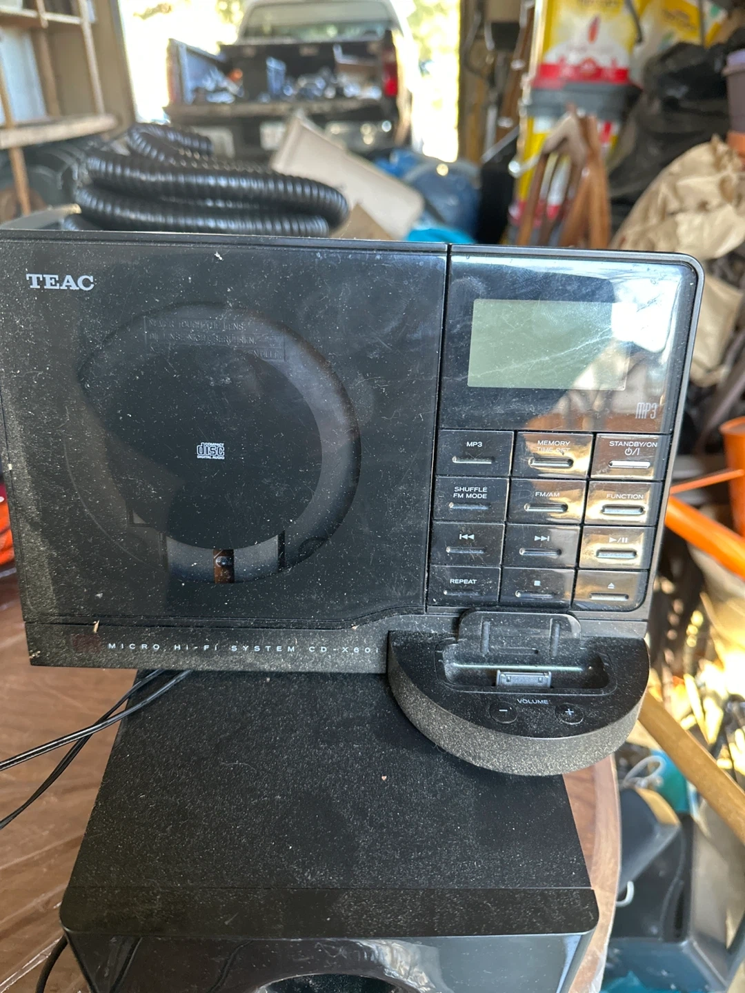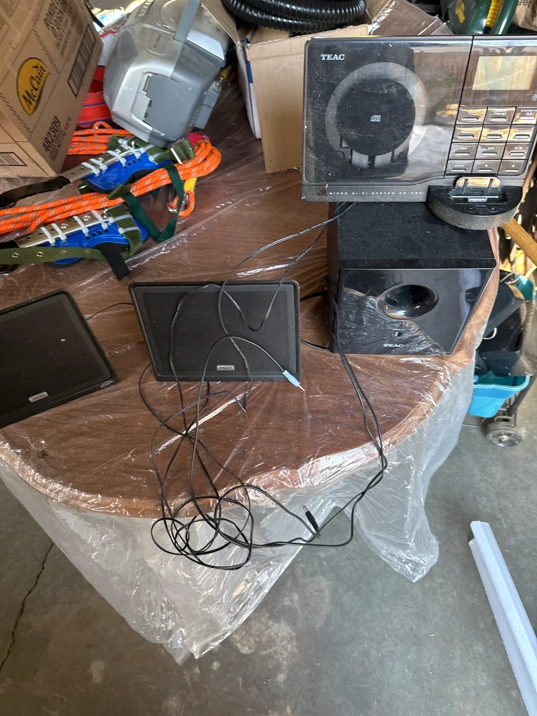 This is a TEAC Micro Hi-Fi System CD-X801 with its speakers. It's a compact audio system that plays CDs and radio. Comes with two satellite speakers and a subwoofer for enhanced sound.