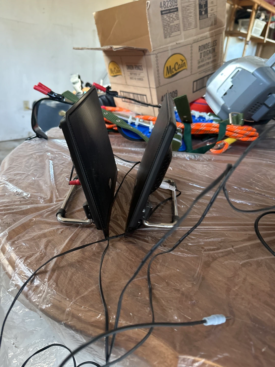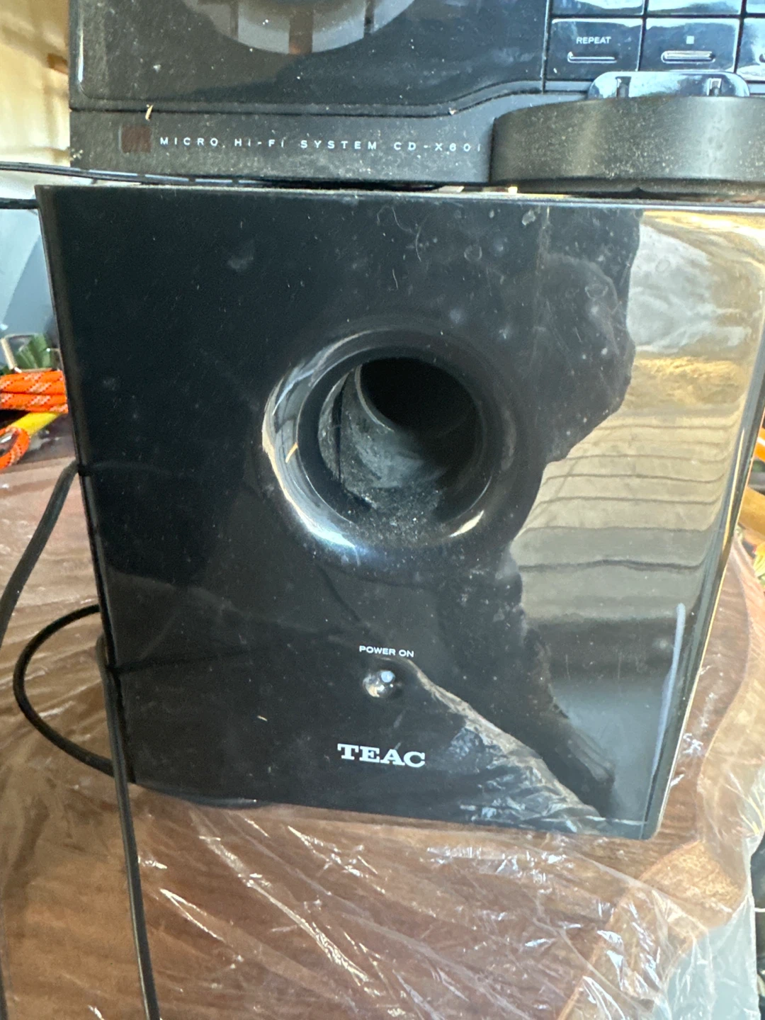 This is a TEAC Micro Hi-Fi System CD-X801 with its speakers. It's a compact audio system that plays CDs and radio. Comes with two satellite speakers and a subwoofer for enhanced sound.