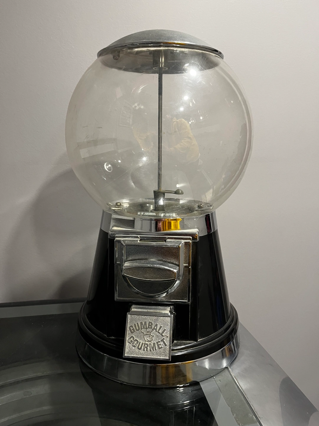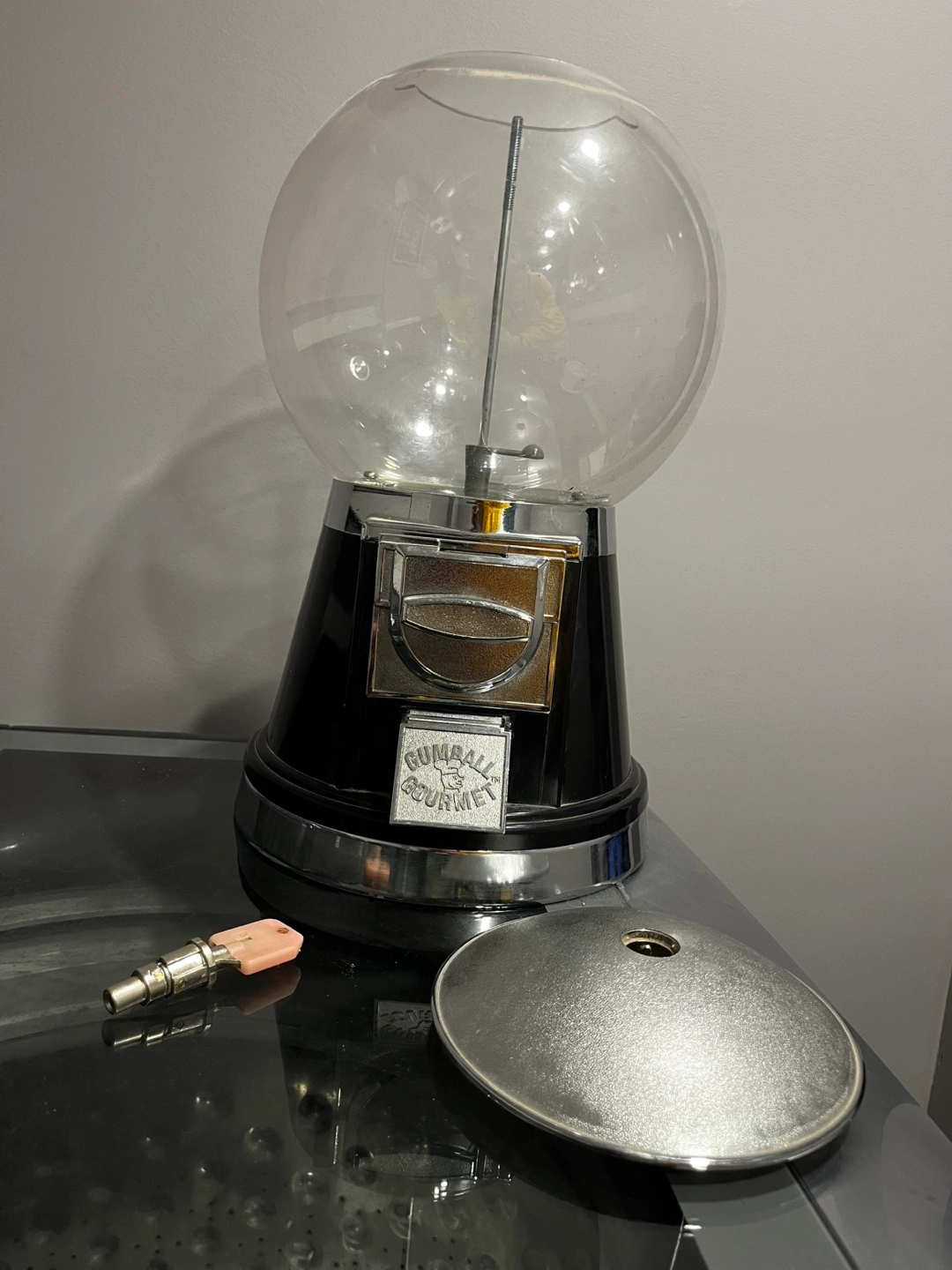 Vintage gumball machine. Black and chrome finish. Includes key. Some wear and tear. Mechanism may require cleaning.