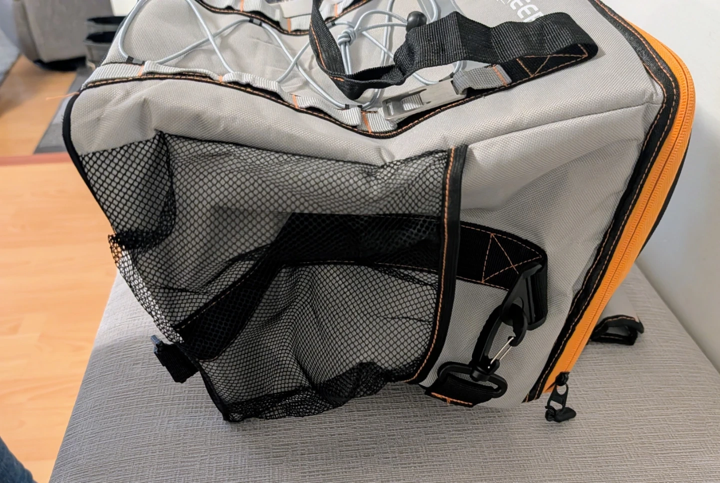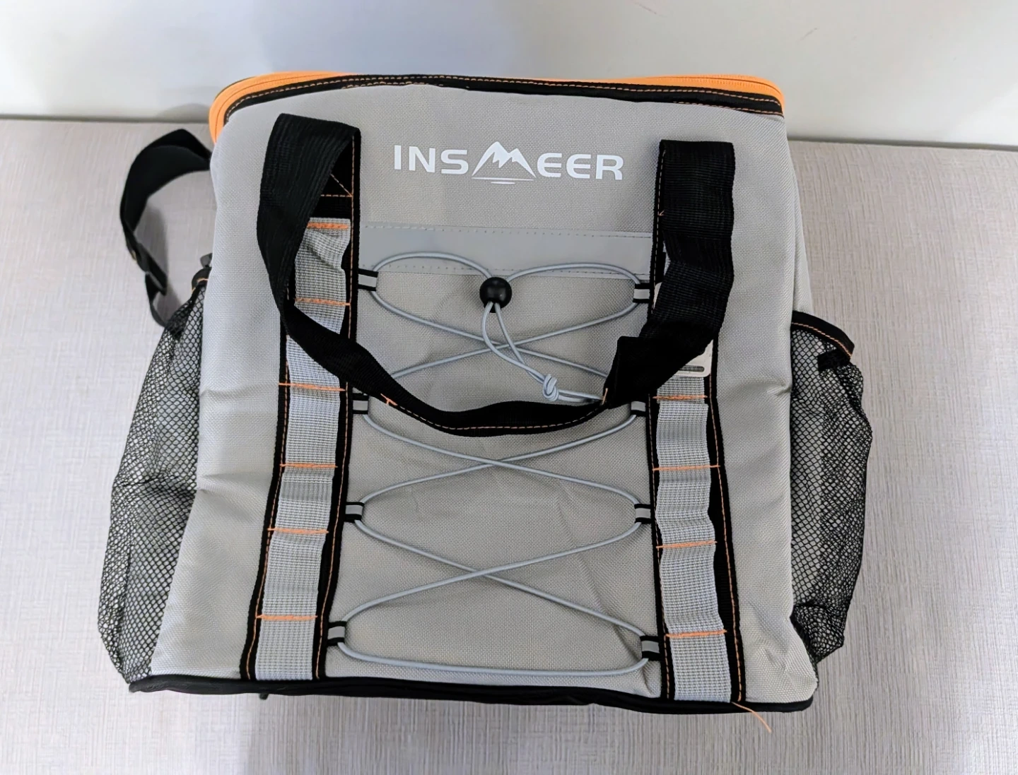 This INSMEER cooler bag is grey with orange accents. It features mesh side pockets and a zippered top compartment. Great for picnics or trips!