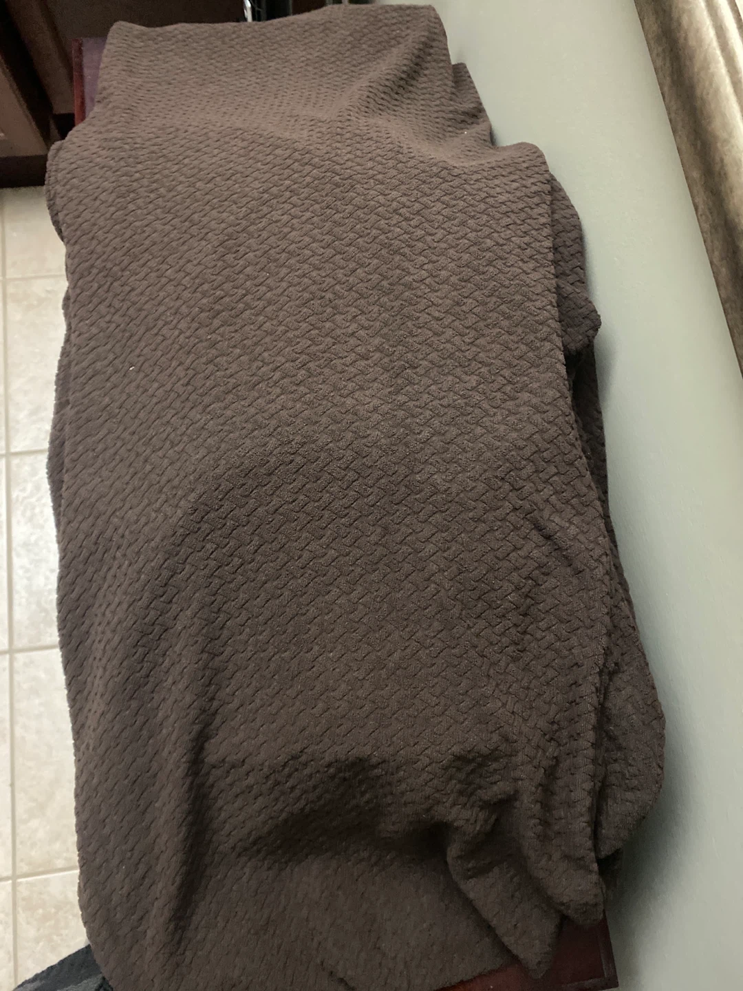 Cozy brown textured blanket throw. It's made of a soft material, perfect for snuggling up on the couch. Measures approximately 50" x 60". There 10