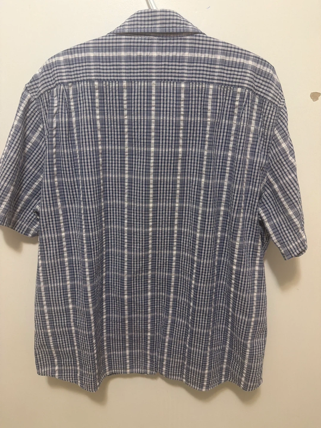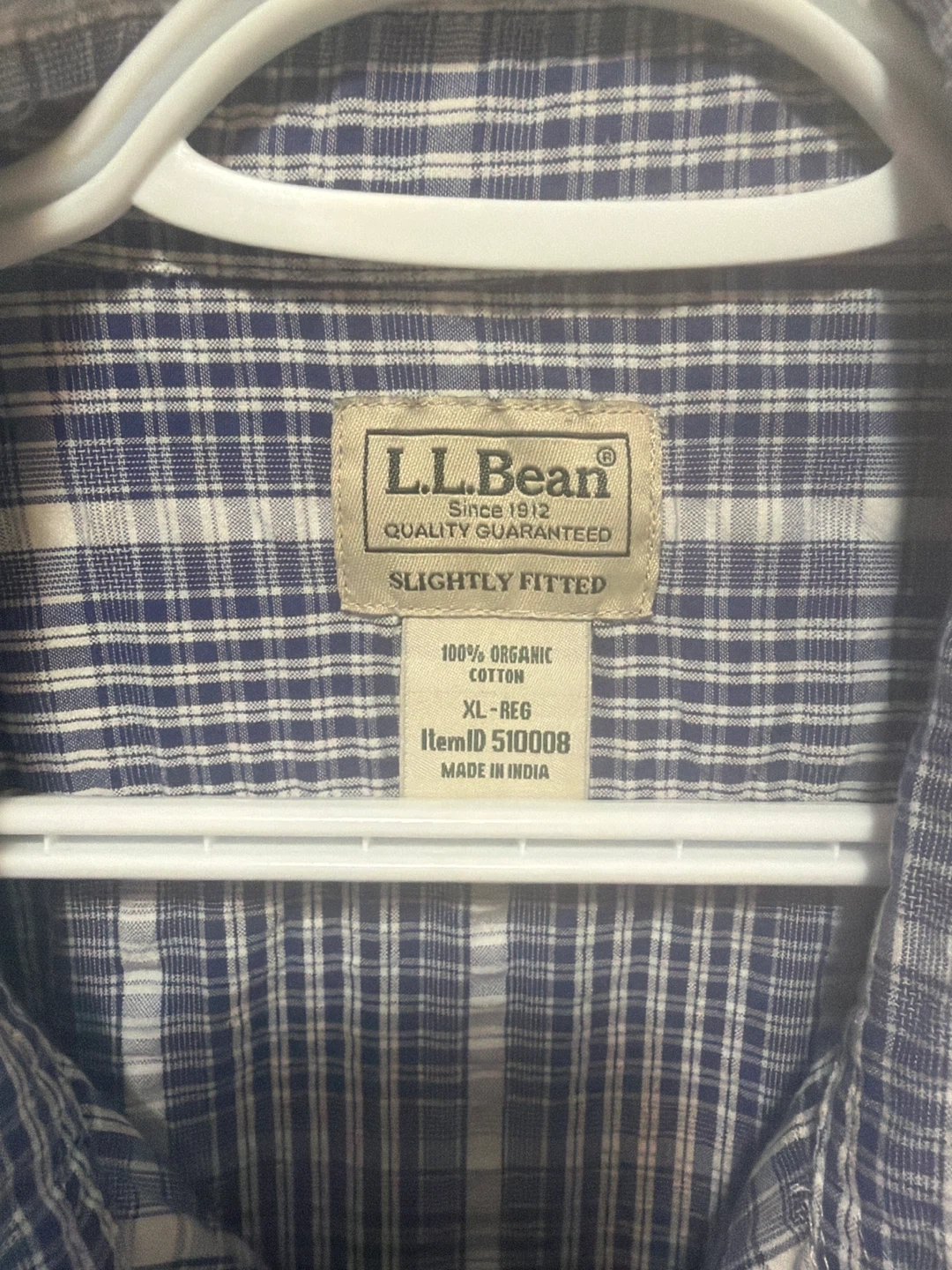 This is an L.L. Bean short-sleeve button-up shirt. It's made of 100% organic cotton. The shirt is a size XL and features a classic blue and white plaid pattern.