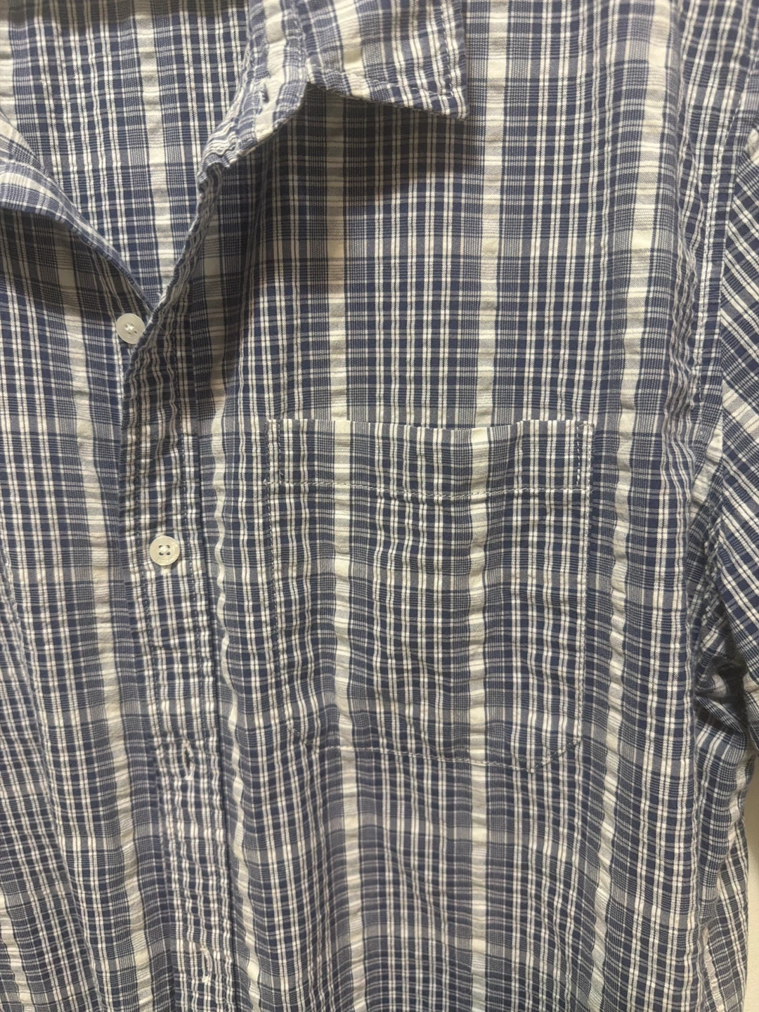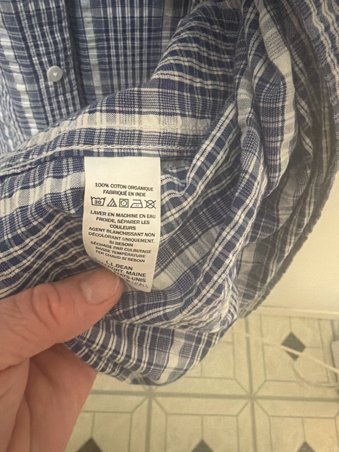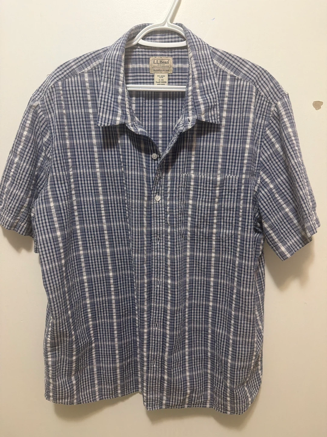 This is an L.L. Bean short-sleeve button-up shirt. It's made of 100% organic cotton. The shirt is a size XL and features a classic blue and white plaid pattern.
