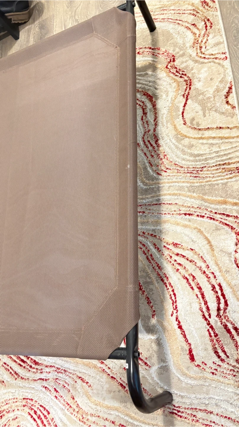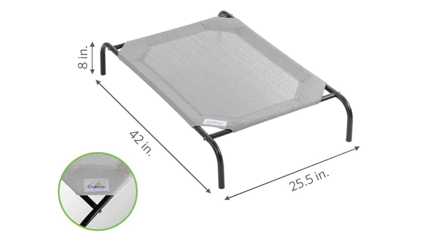 This Coolaroo elevated pet bed is 42 inches long by 25.5 inches wide and 8 inches high. It's made from a durable, breathable mesh fabric. Elevated design helps keep pets cool and comfortable.