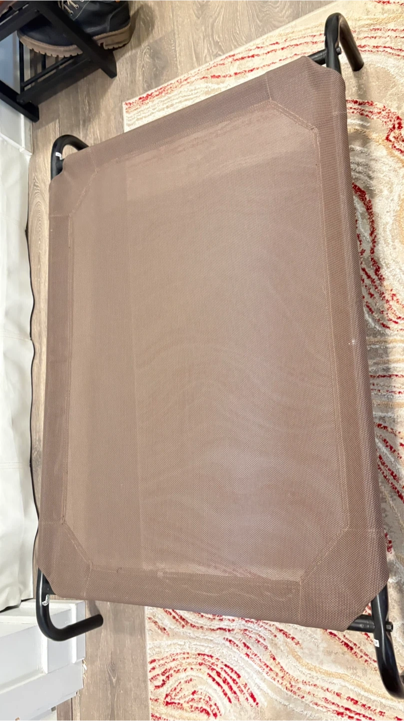 This Coolaroo elevated pet bed is 42 inches long by 25.5 inches wide and 8 inches high. It's made from a durable, breathable mesh fabric. Elevated design helps keep pets cool and comfortable.