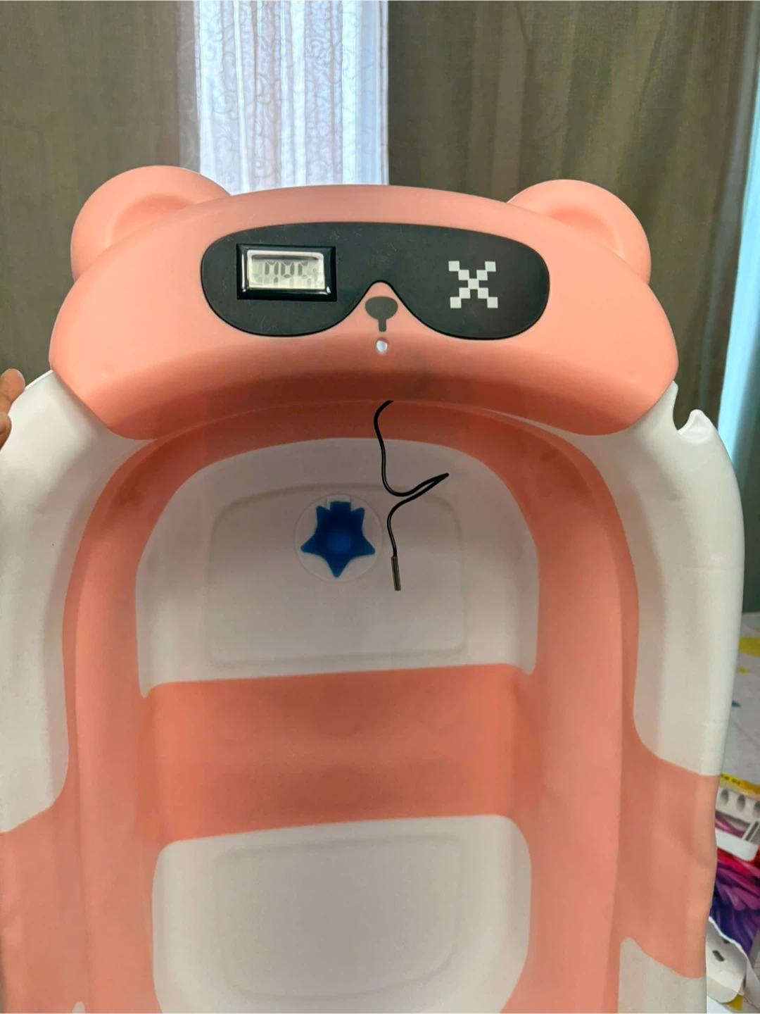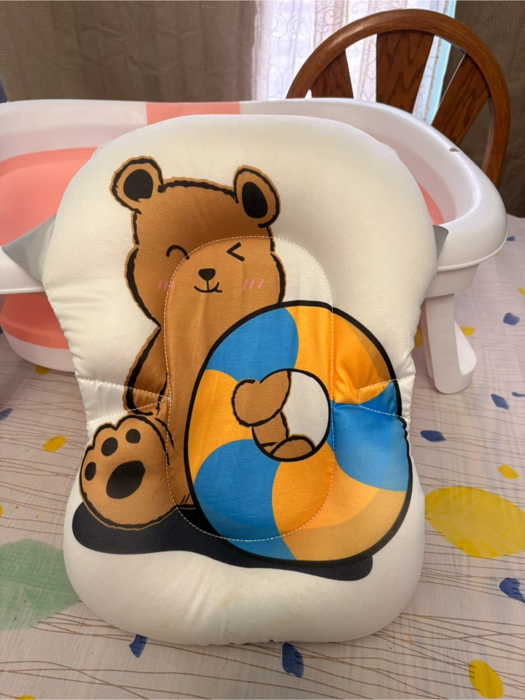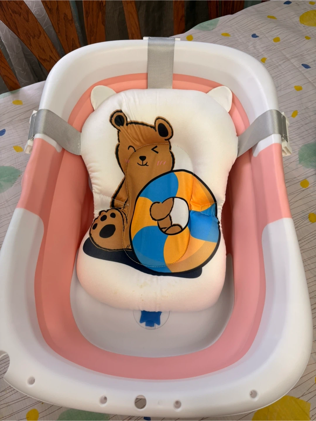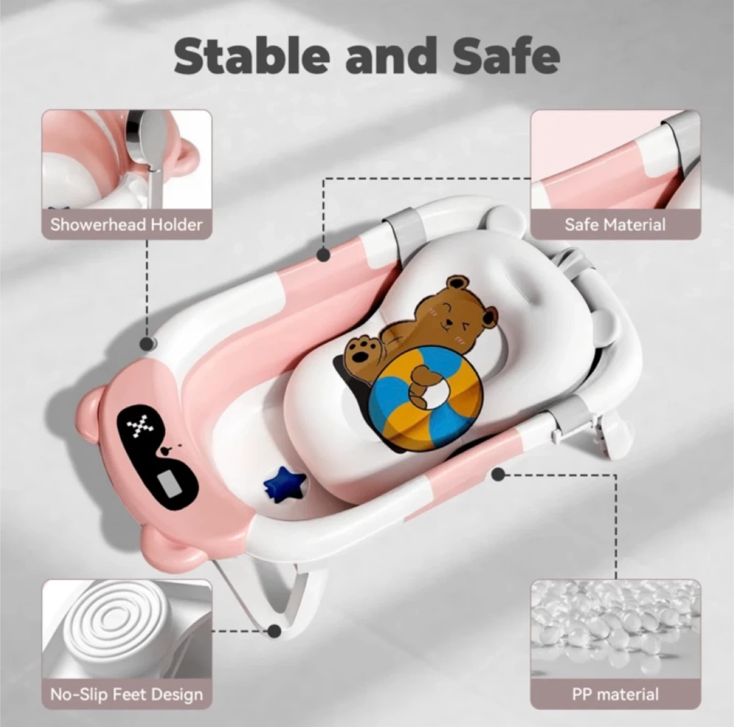 This pink and white collapsible baby bathtub includes a cute bear-themed cushion for comfort. It's made from safe PP material with a no-slip feet design for added stability. The tub also features a showerhead holder.