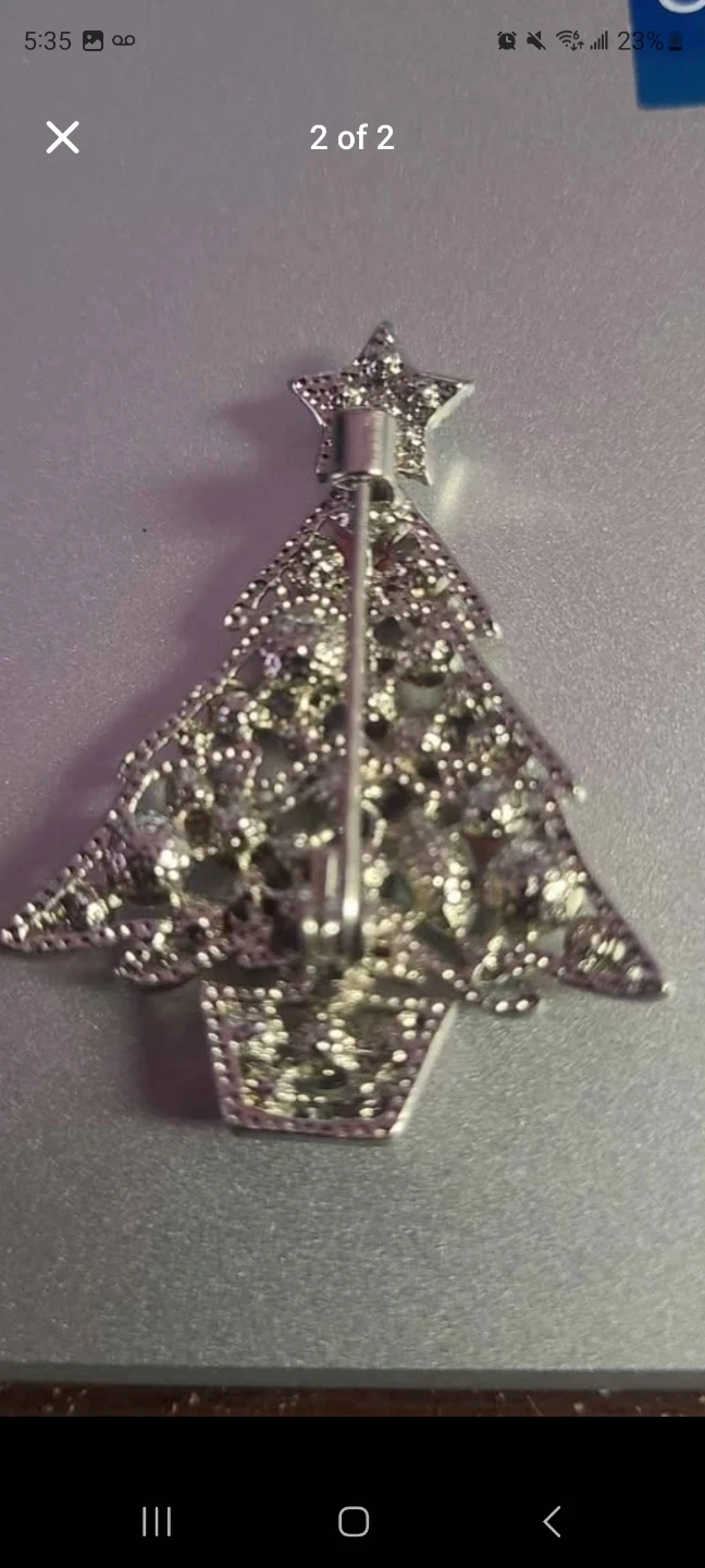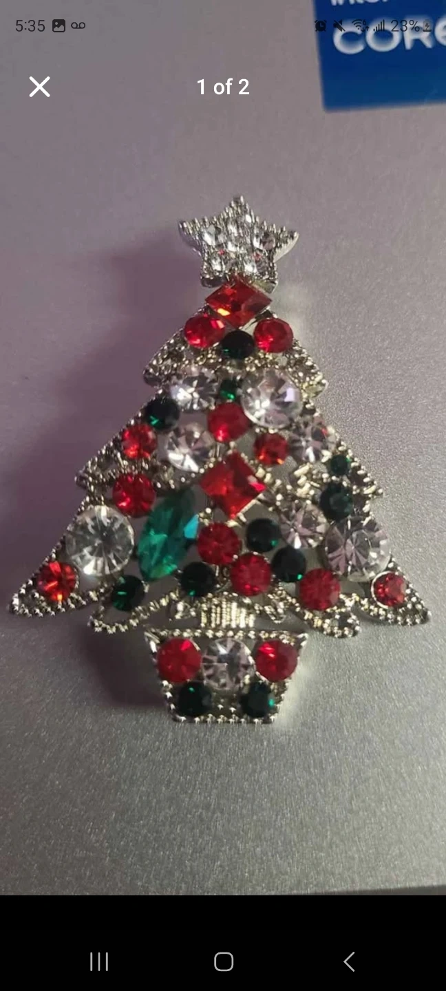 This festive brooch features a Christmas tree design adorned with red, green, and clear rhinestones. It has a secure pin backing. Perfect for adding some holiday sparkle to your outfit!
