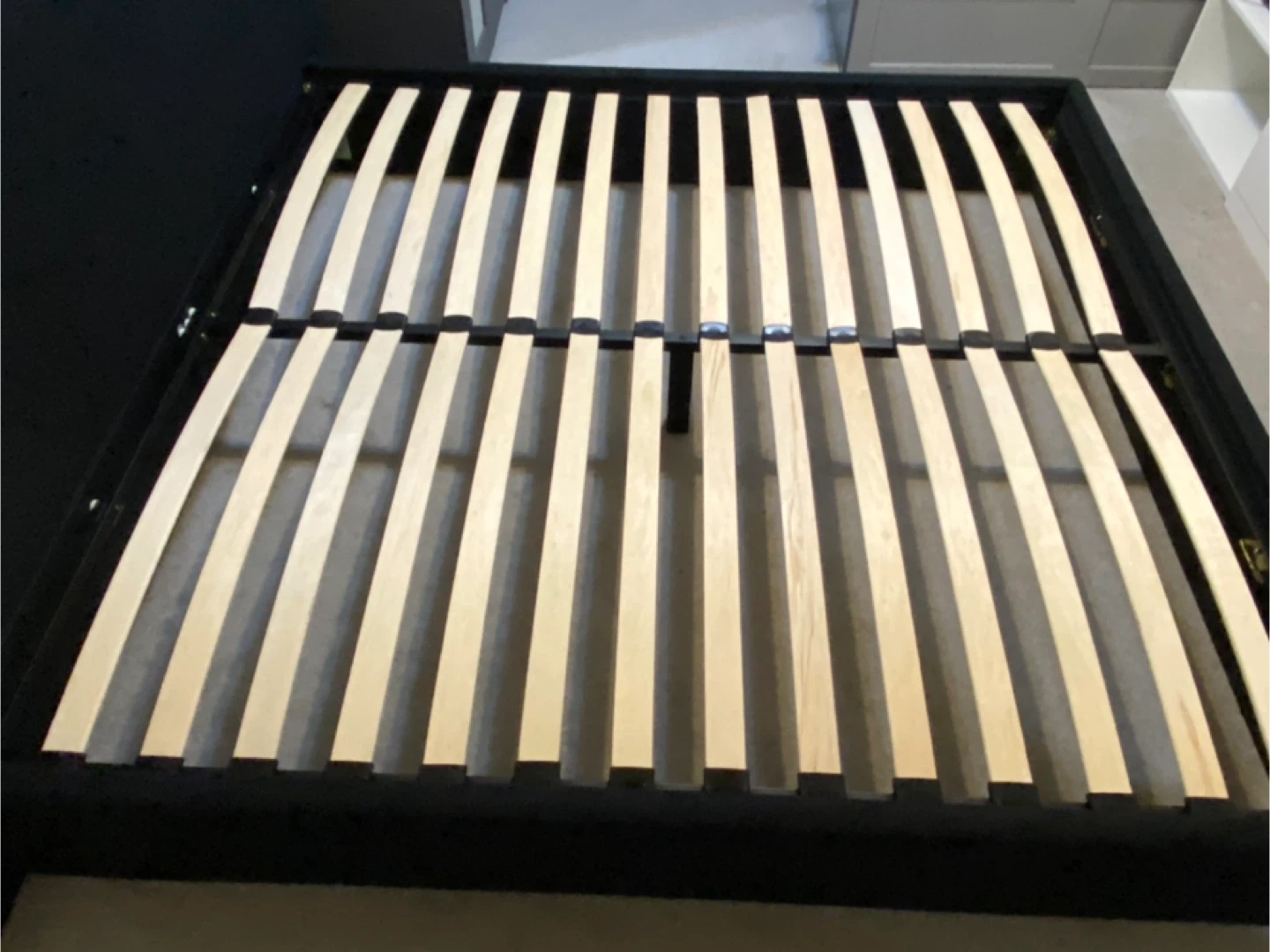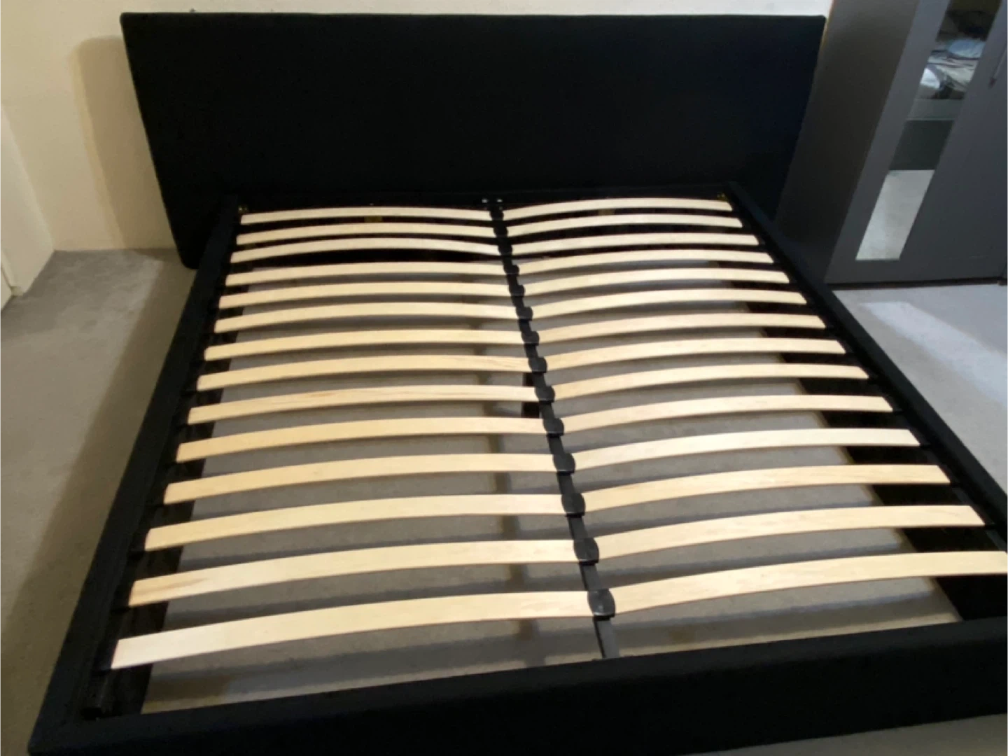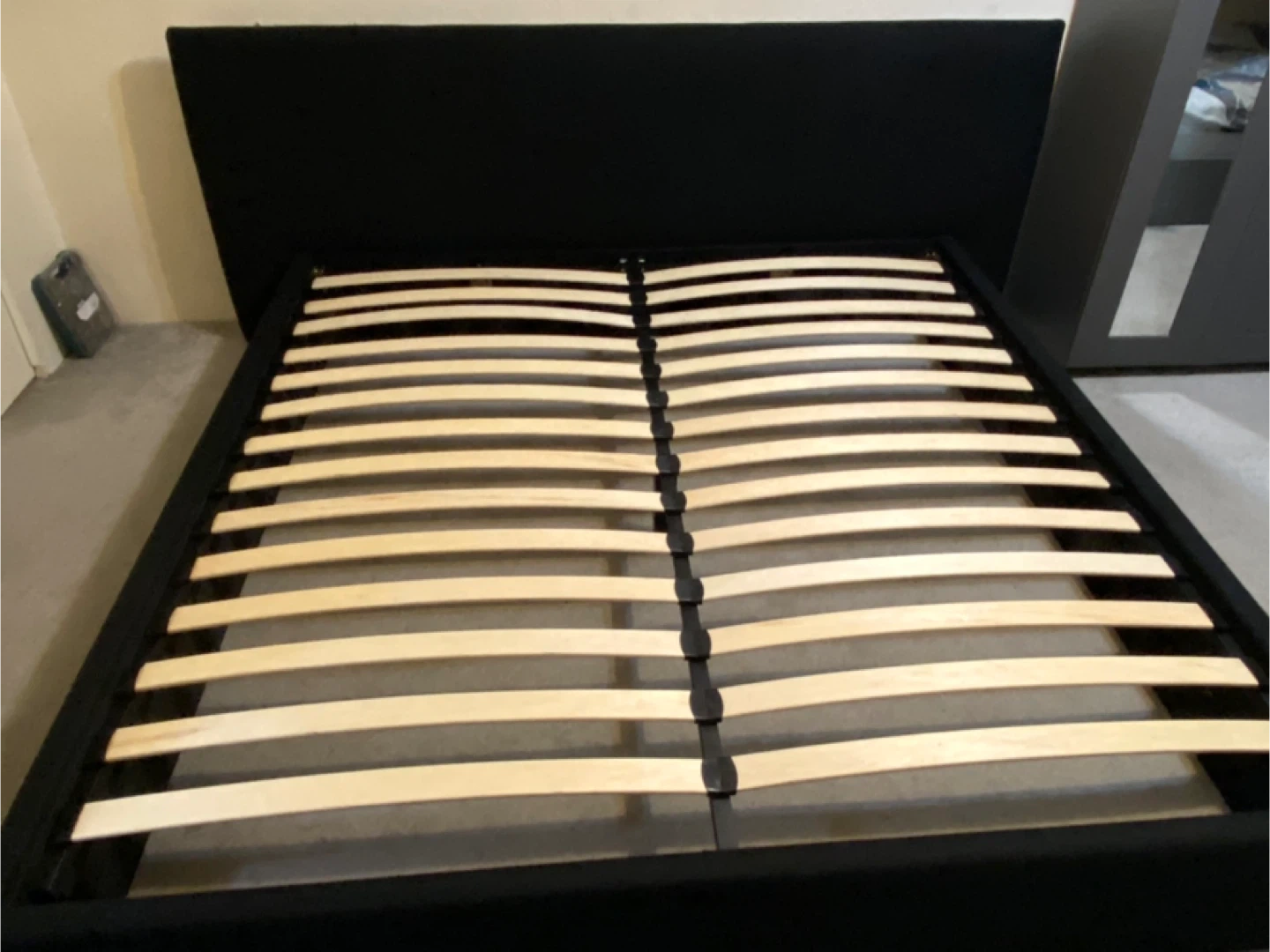 This bed frame features a modern upholstered design in black. It has a supportive wooden slat system for your mattress. Free Assembly with in 10 km of surrey centre station.
