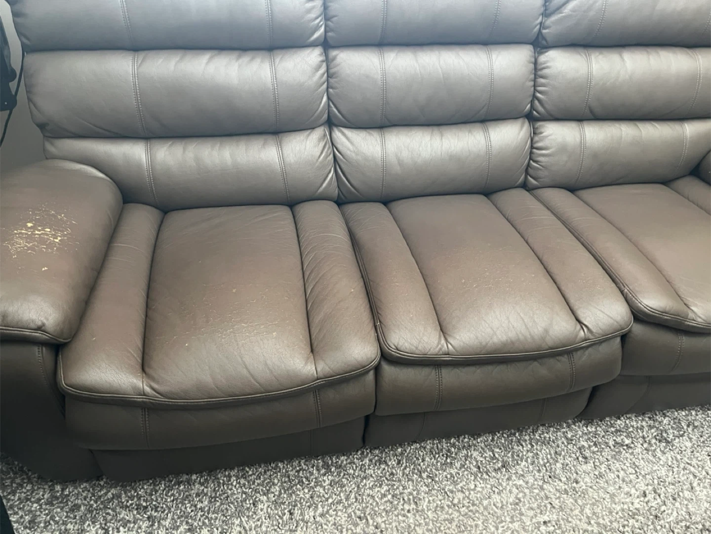 A brown /green leather sofa recliner with visible wear, particularly on the left armrest. It's a three-seater with plush cushions. This sofa would be useful for a starter home or a casual living space.