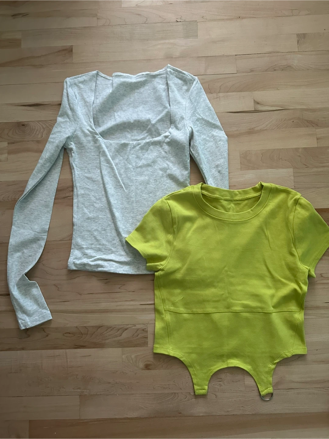 Selling a bundle of two women's tops! Includes a light grey long-sleeve top, and a green t-shirt. Perfect for adding some variety to your wardrobe.