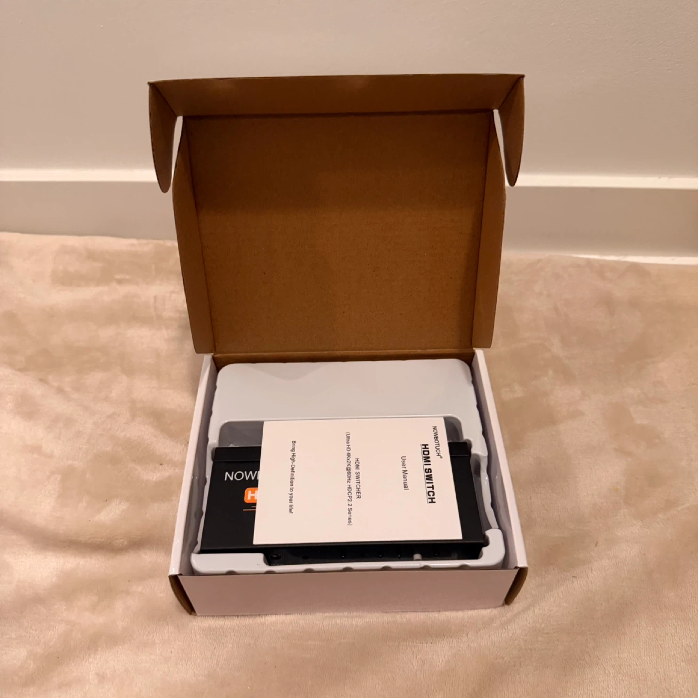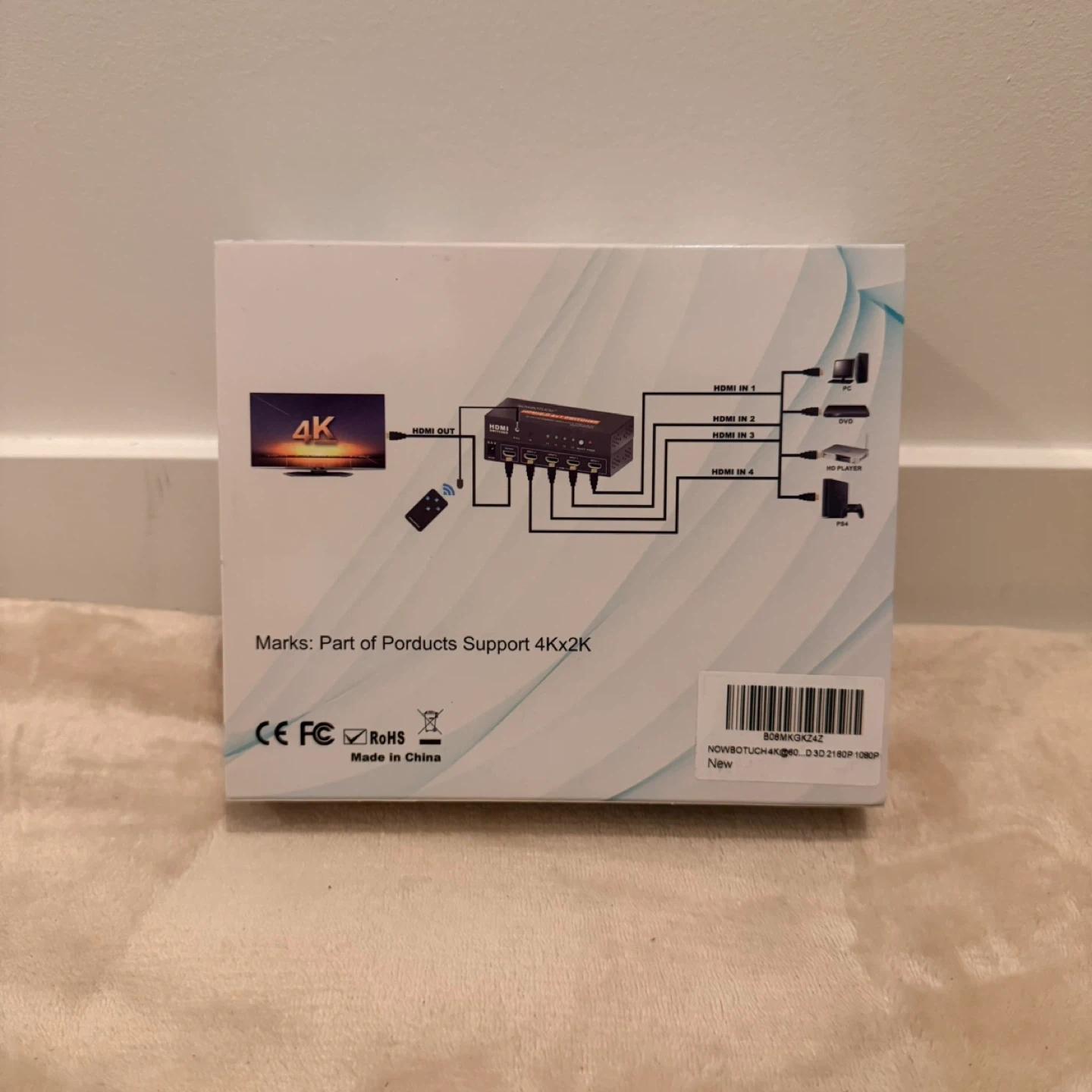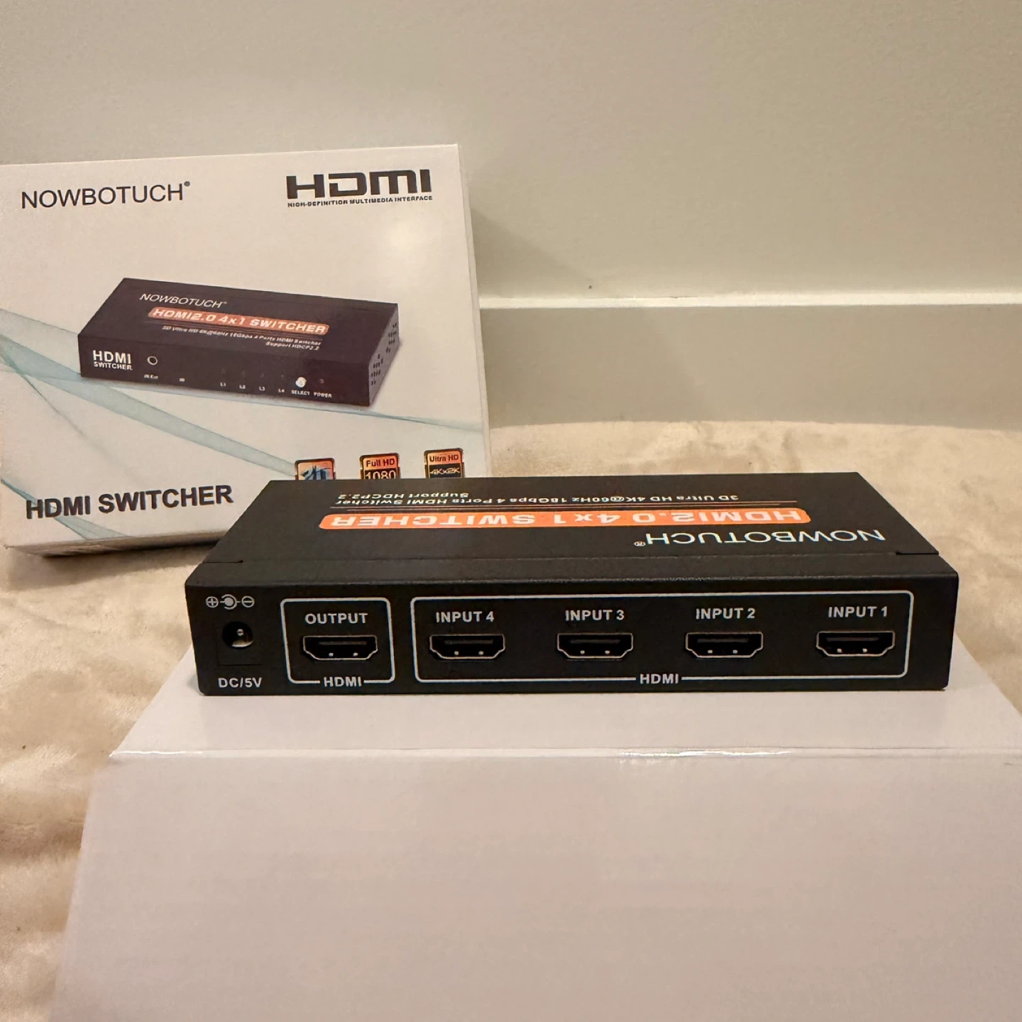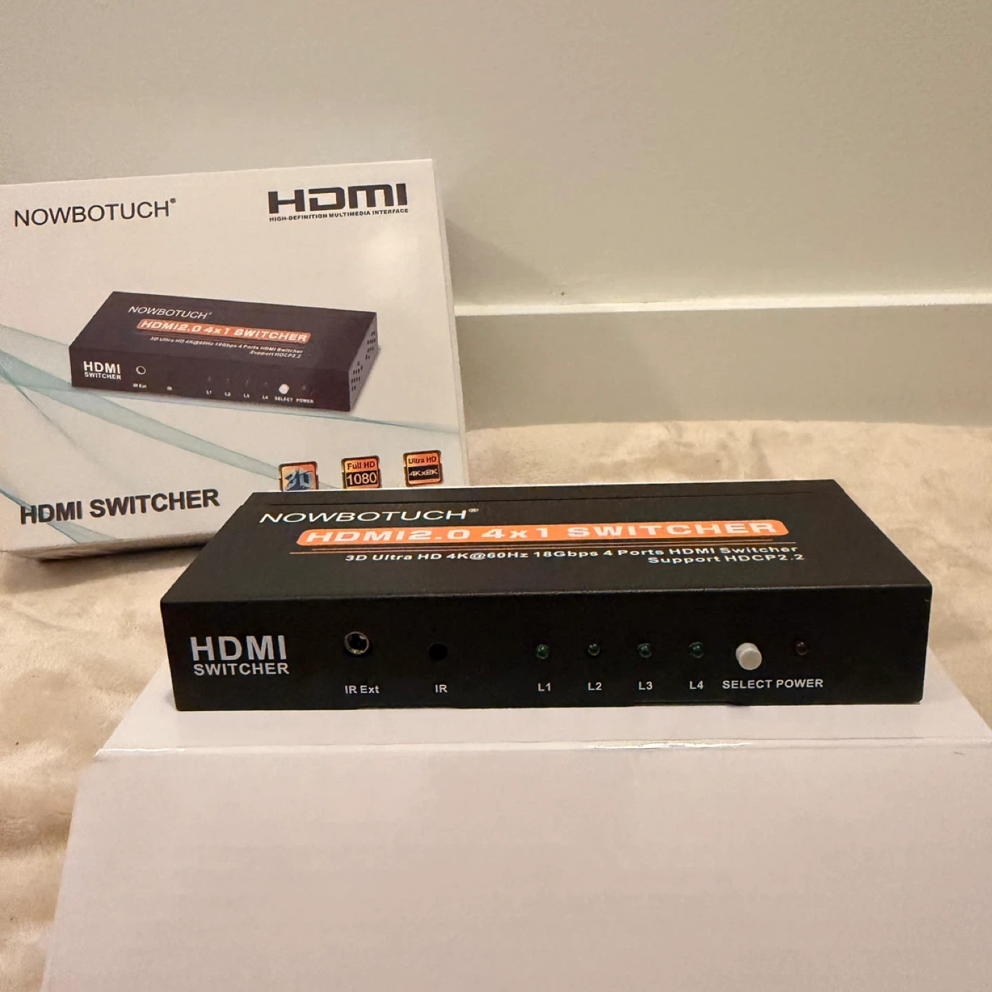 NOWBOTUCH HDMI 2.0 4x1 switcher. Supports 4K Ultra HD at 60Hz and 18Gbps. Includes original box and user manual. It comes with four HDMI inputs and one output.