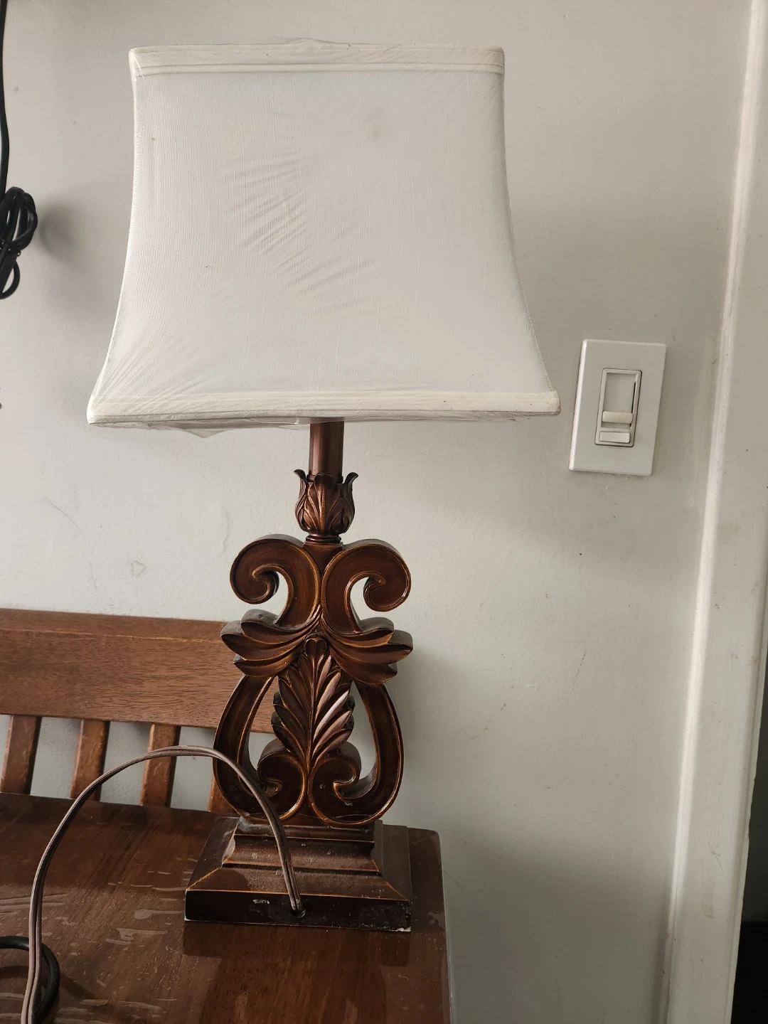 This decorative table lamp has a dark wood-look base with ornate carvings. It features a white fabric lampshade. A nice accent piece for any room!