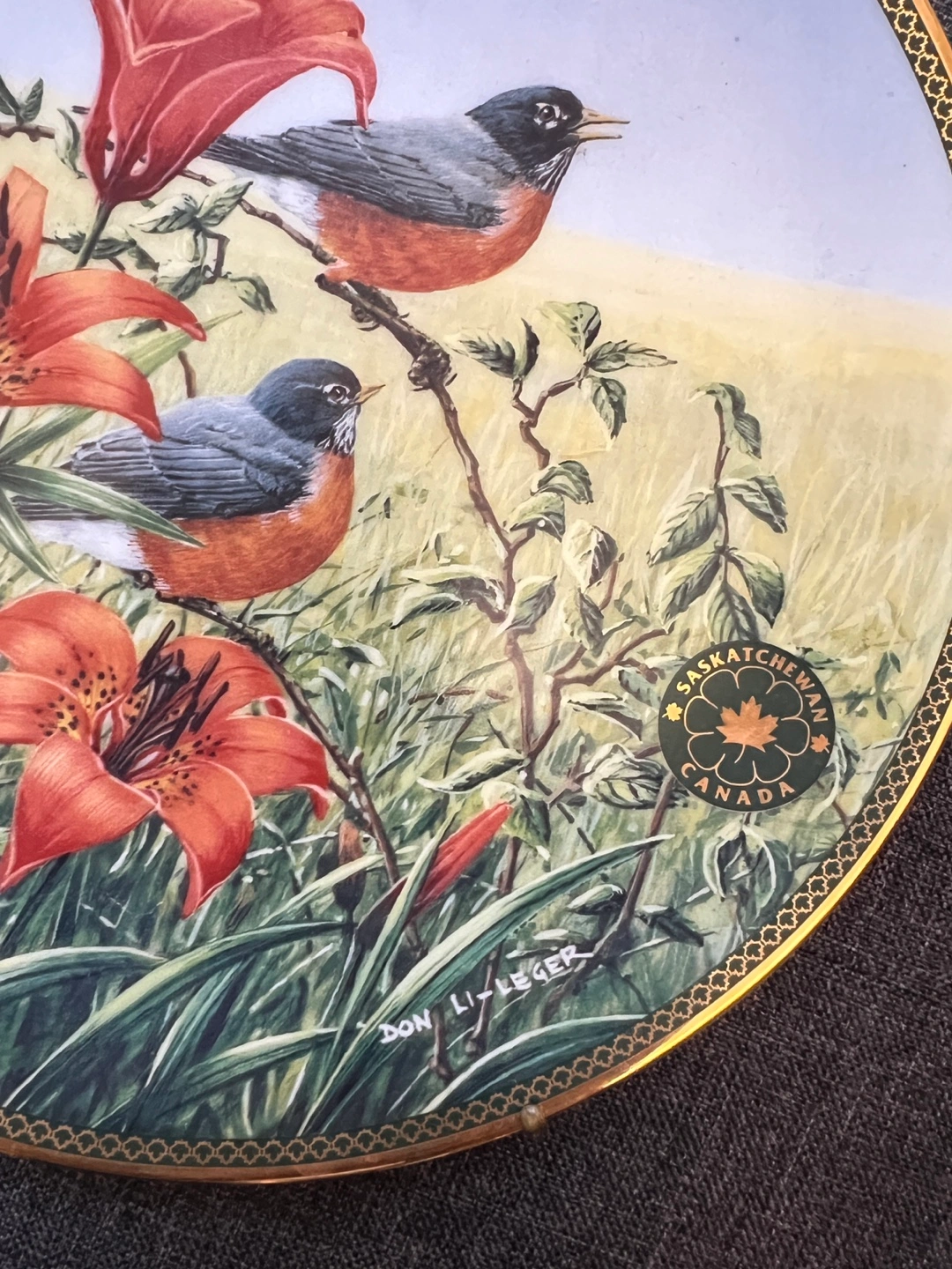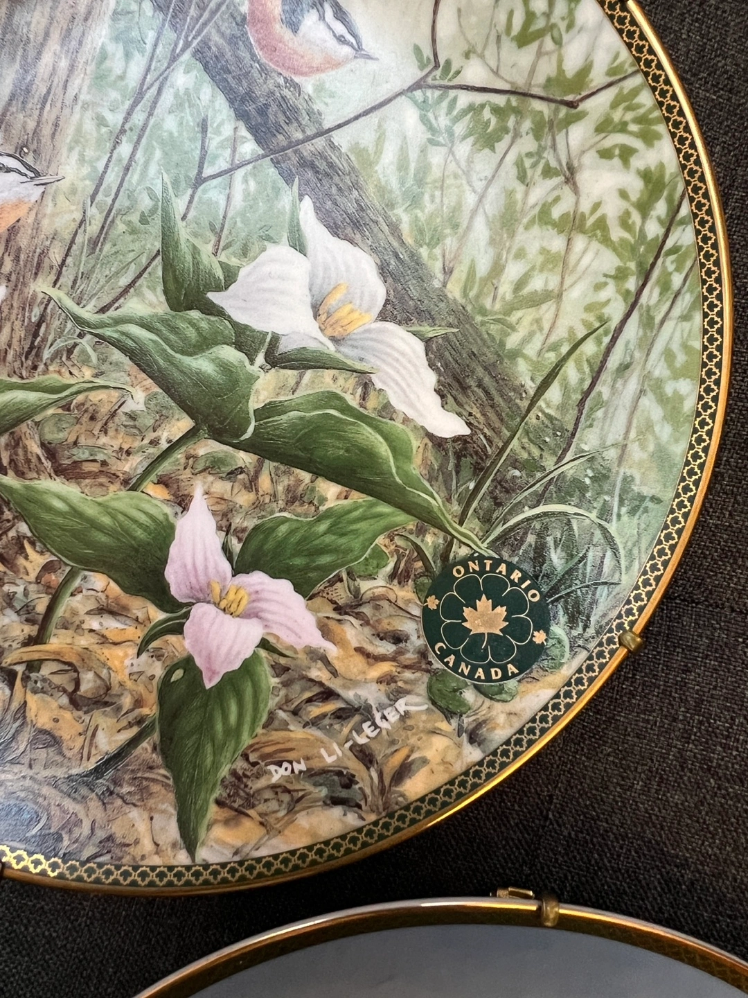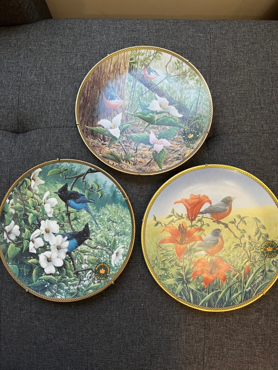 Beautiful set of three collector plates. Each plate features artwork by Don Léger and depicts various Canadian birds and flowers. Gold-trimmed edges. Wall-hanging capability. From the "Flowers of the Canadian Provinces" collection. Excellent condition.