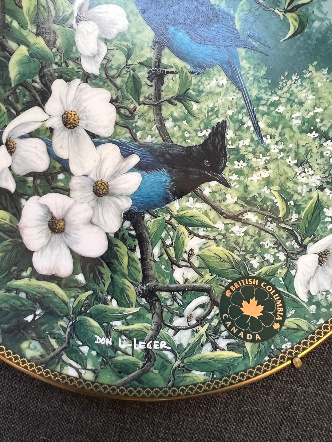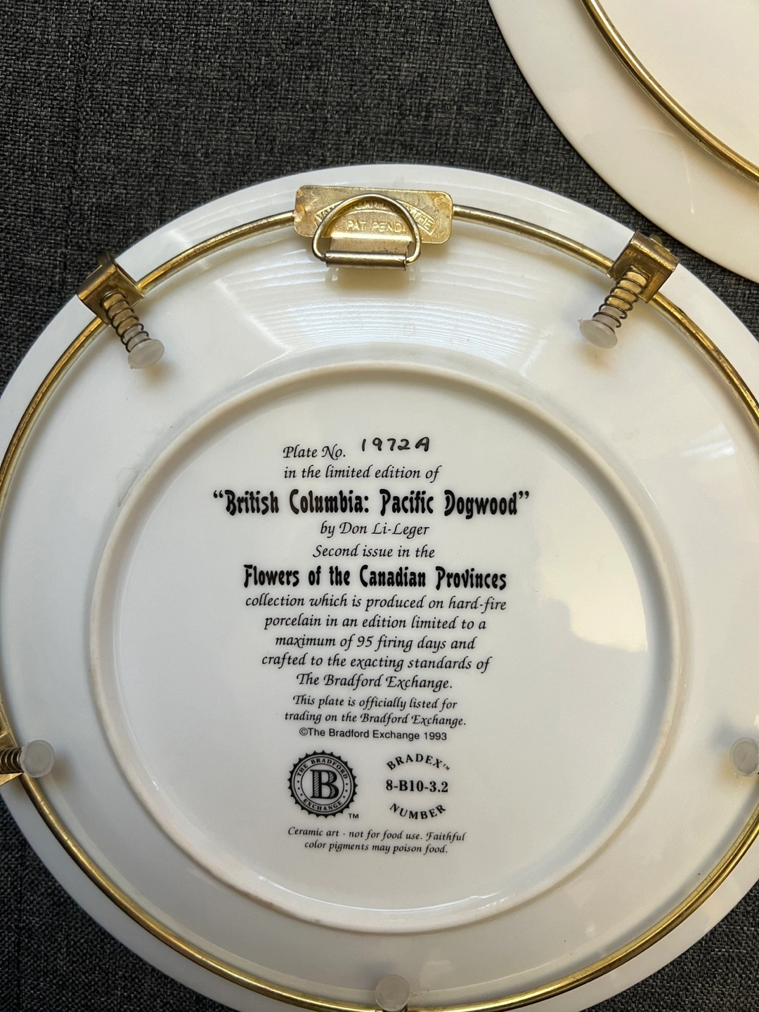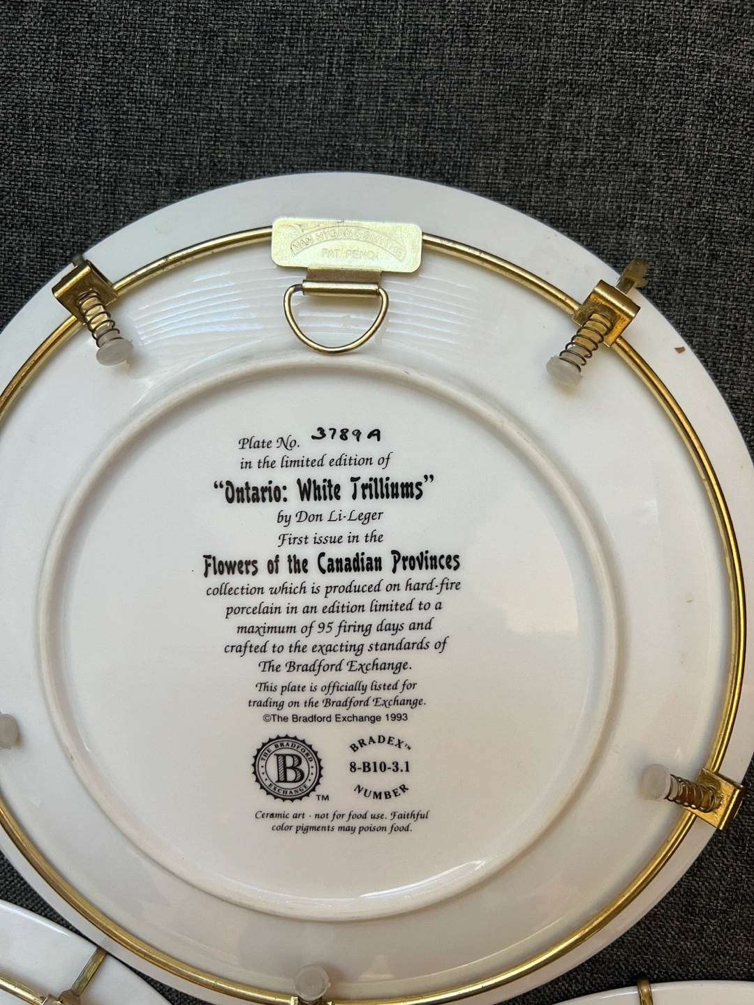 Beautiful set of three collector plates. Each plate features artwork by Don Léger and depicts various Canadian birds and flowers. Gold-trimmed edges. Wall-hanging capability. From the "Flowers of the Canadian Provinces" collection. Excellent condition.