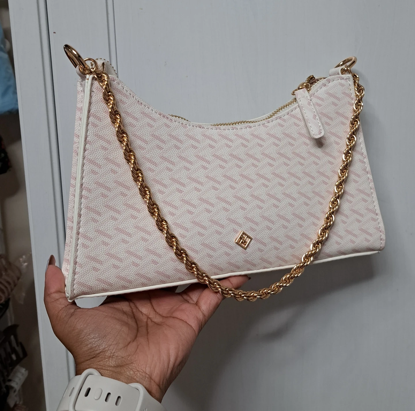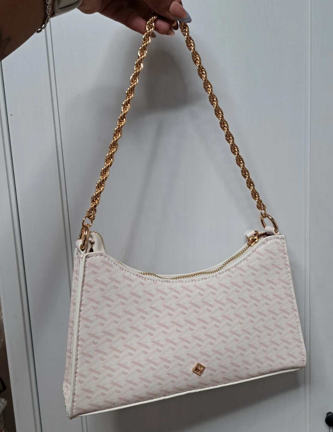White shoulder bag with a repeating pink pattern. It has a gold chain strap and an optional white crossbody strap. Zip closure.
