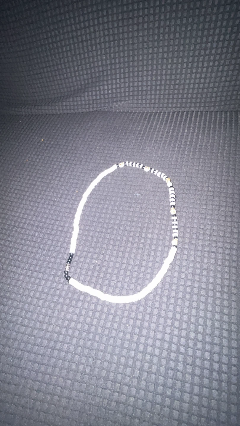 White beaded necklace with black and white striped accents. This necklace features a unique pattern of beads. It's a simple accessory for everyday wear.