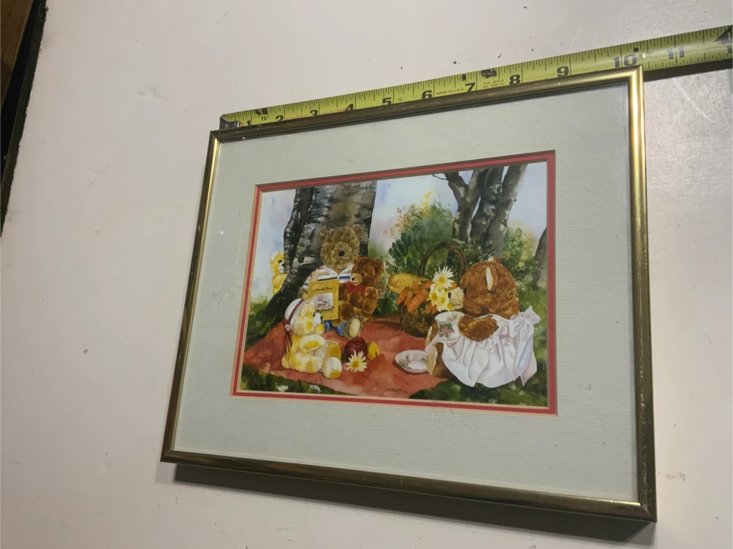 A charming framed art print depicting teddy bears enjoying a picnic outdoors. It's matted and ready to hang. The art appears to be a watercolor style illustration.