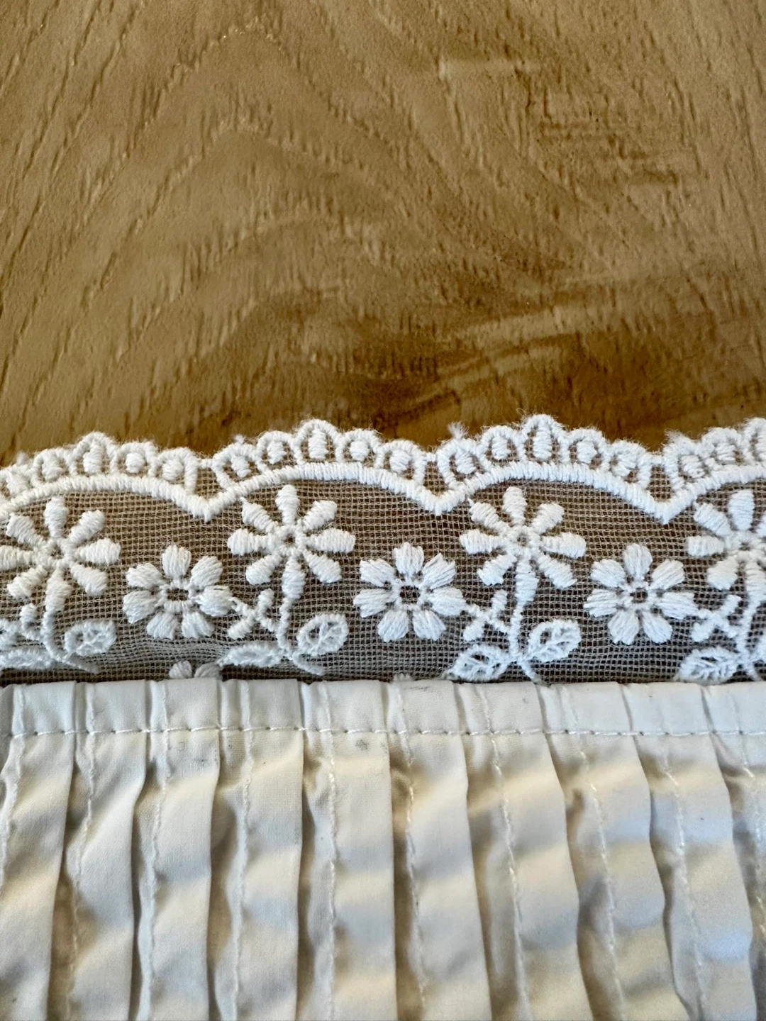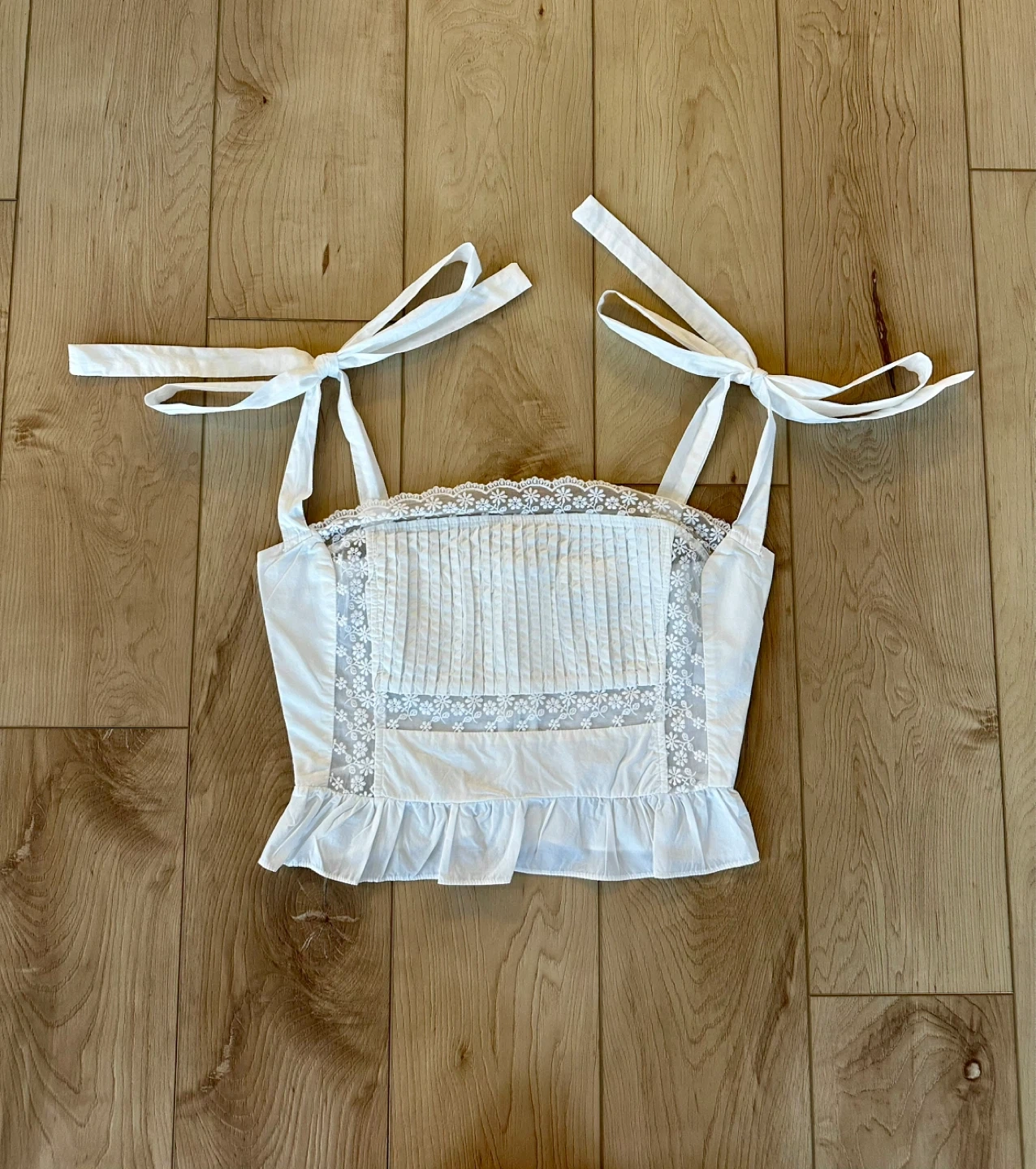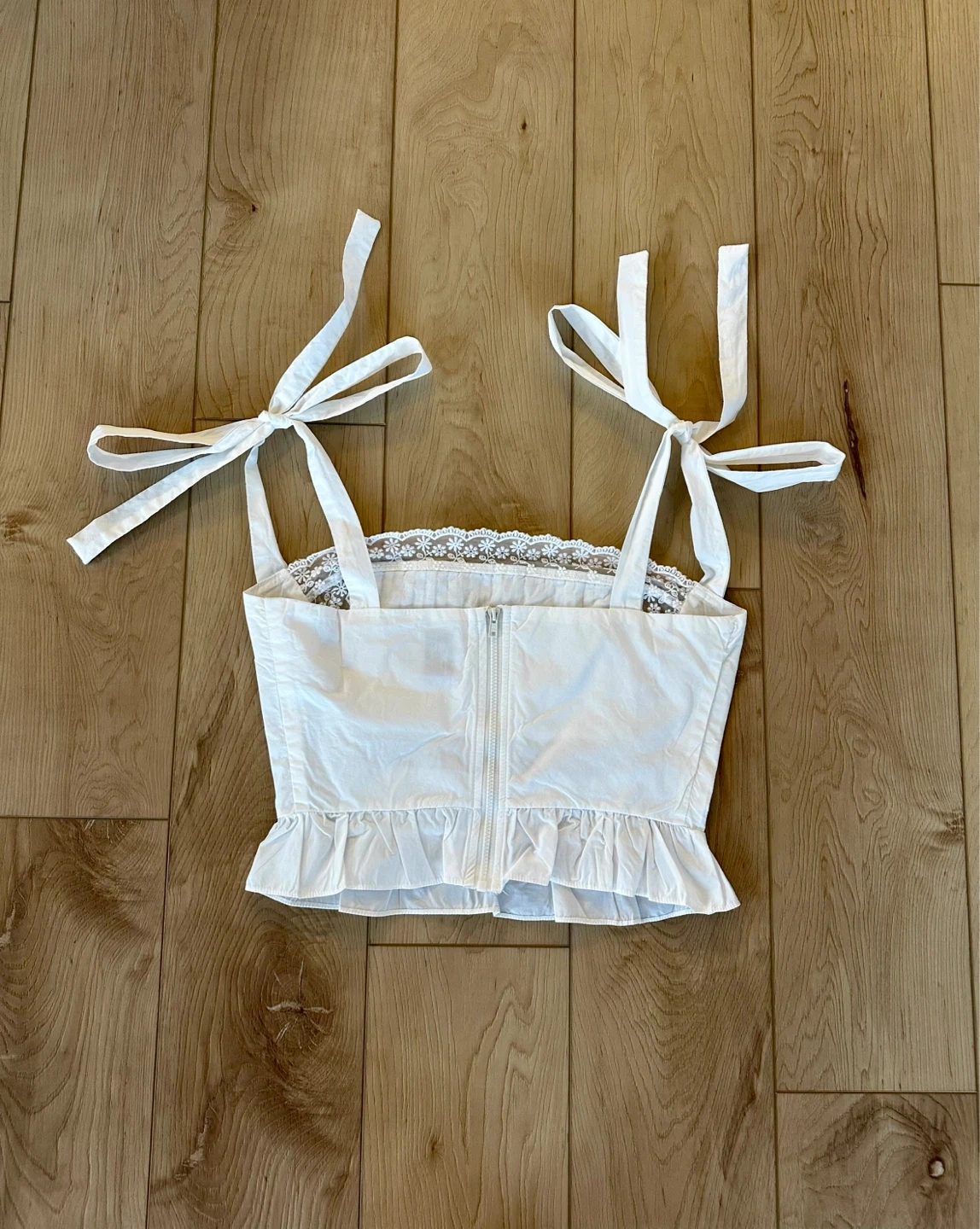 Princess Polly top with lace detailing and ruffled hem. Features adjustable tie shoulder straps and a back zipper. Material is cotton.