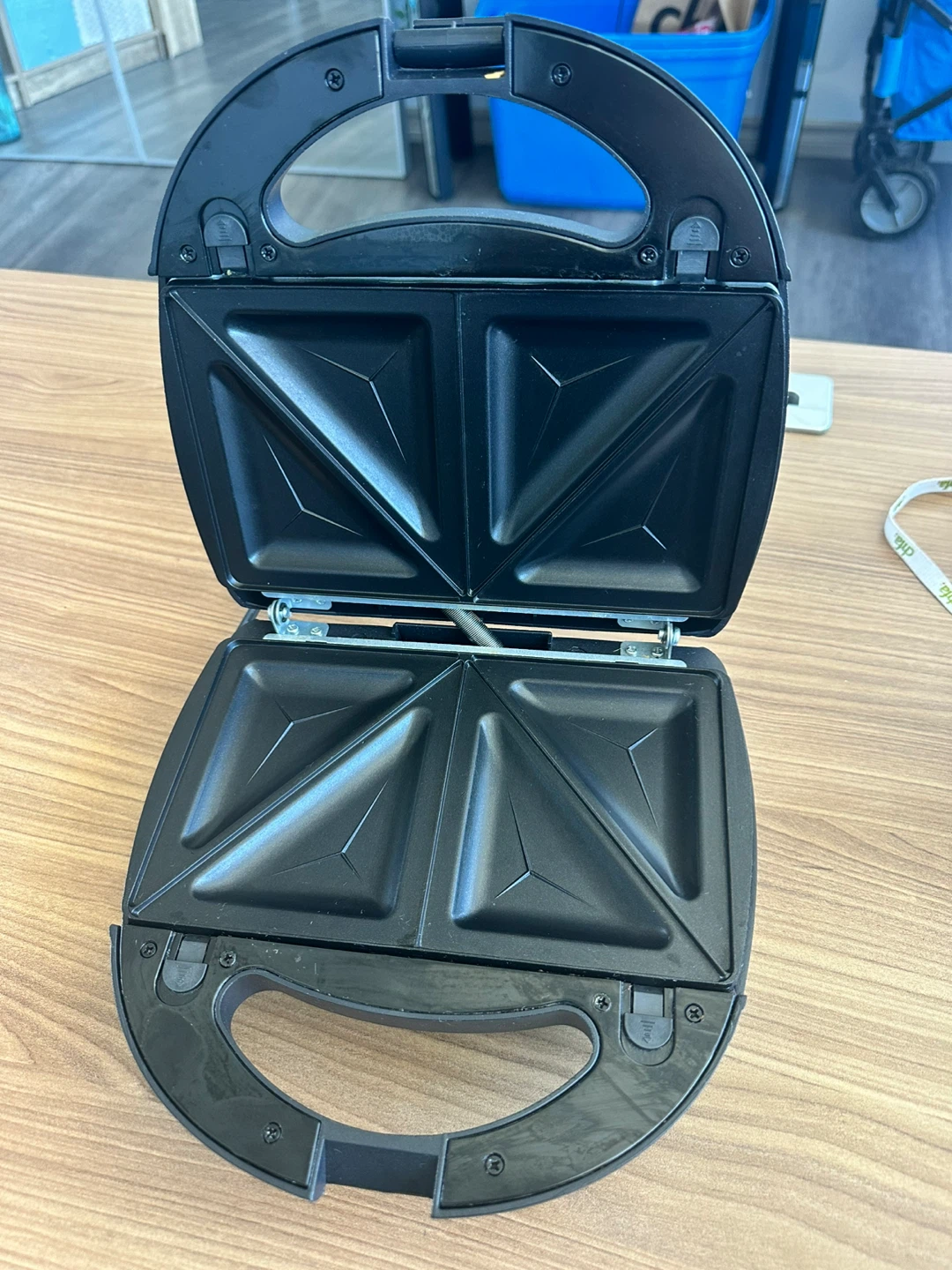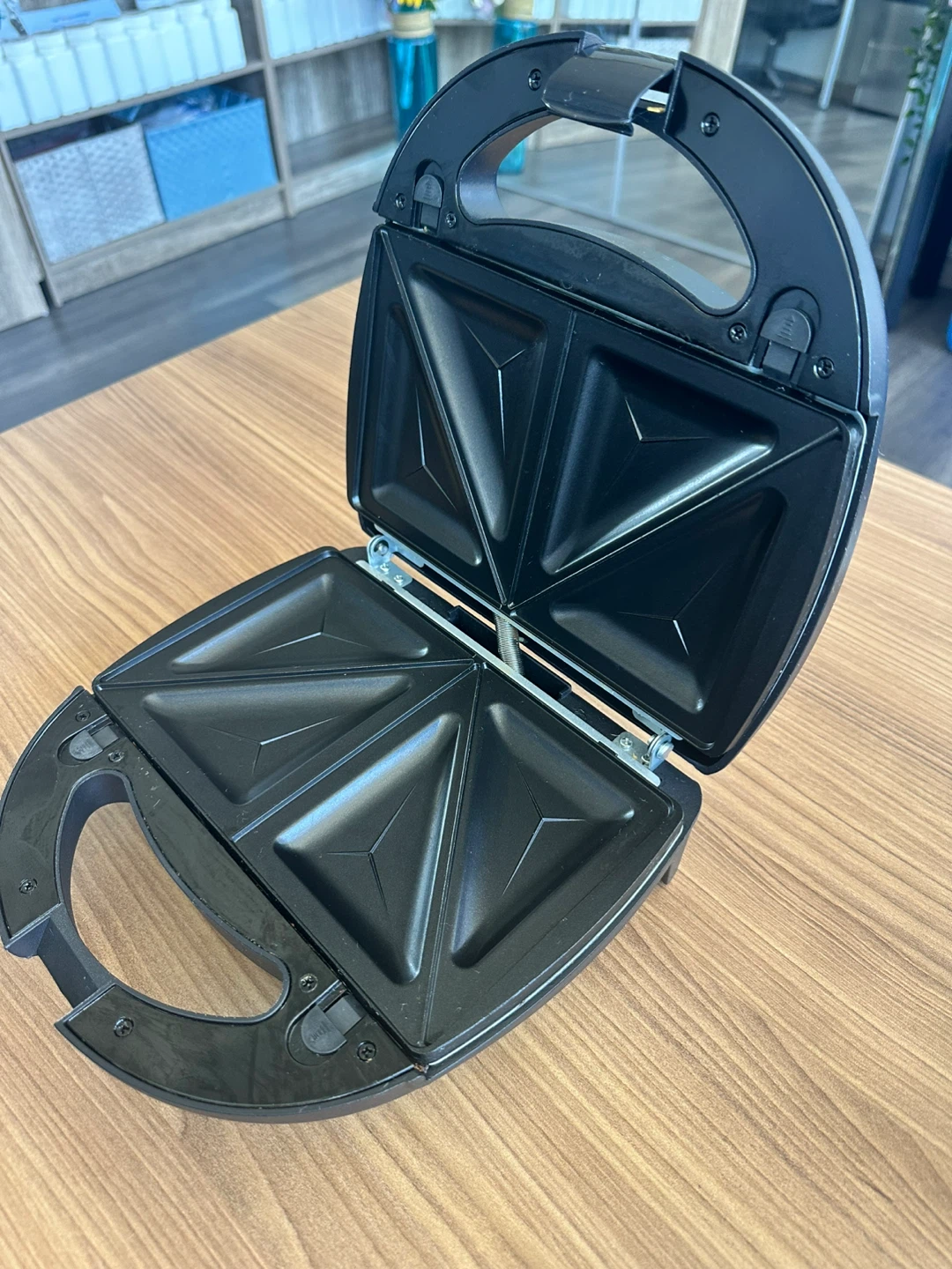 It's a Salton sandwich maker with non-stick plates for easy cleanup. It has indicator lights for power and readiness. Makes four triangular sandwiches.