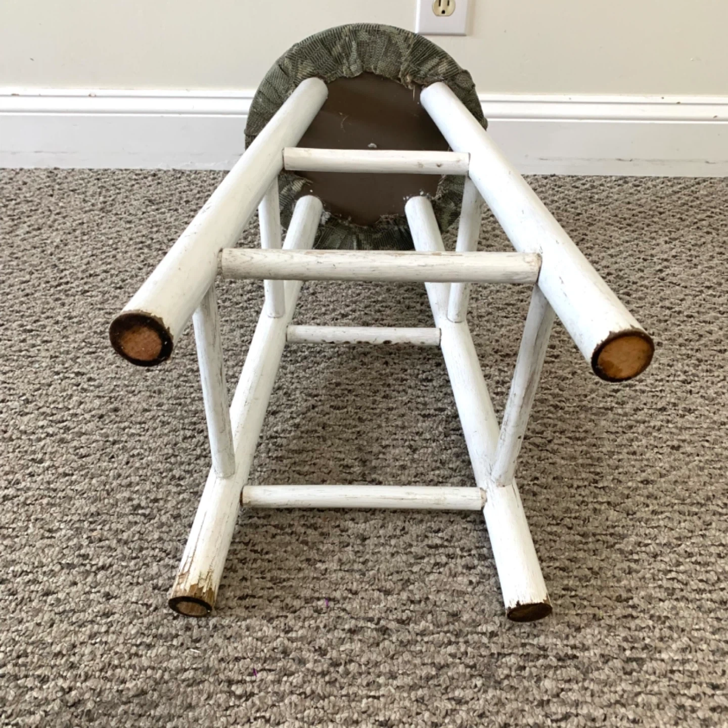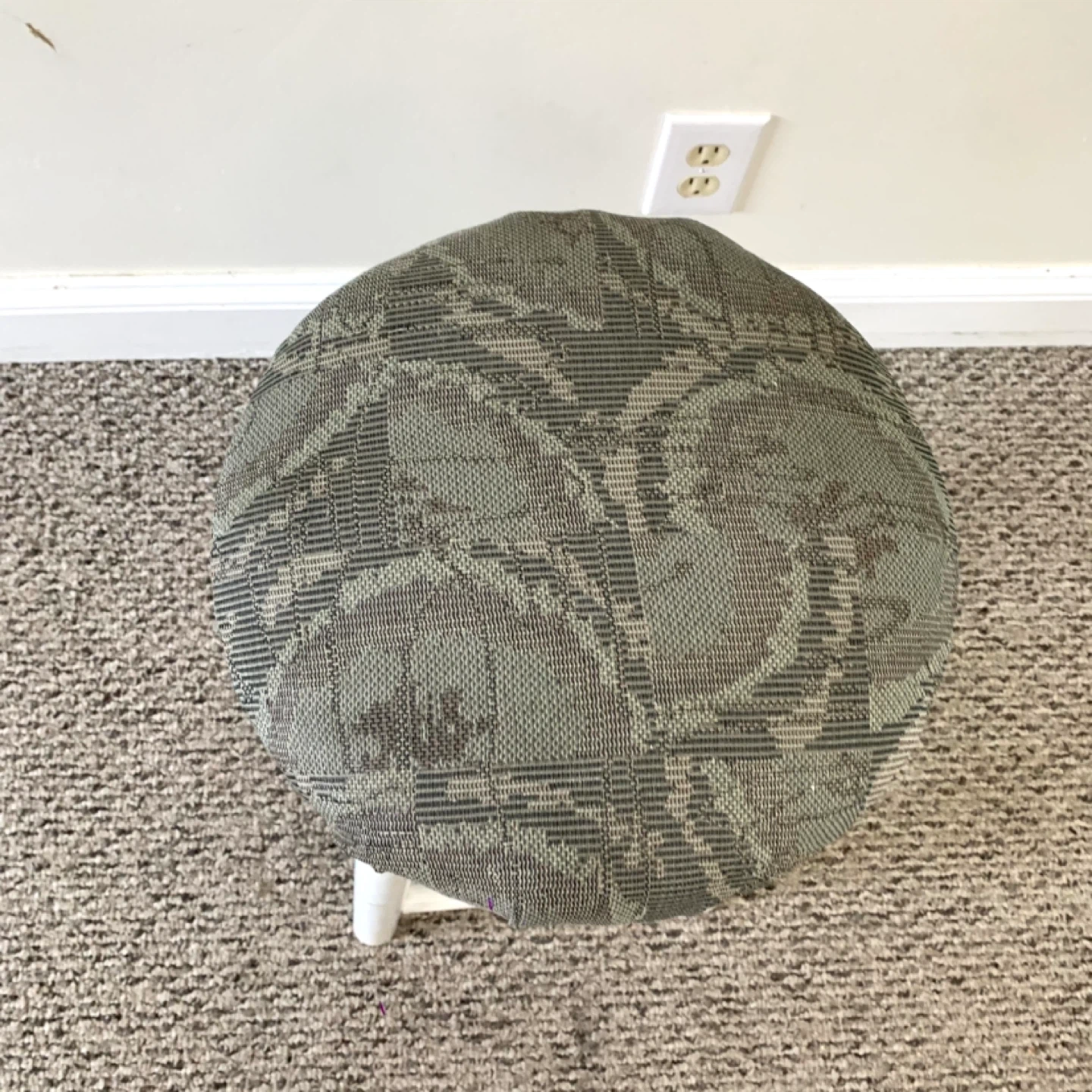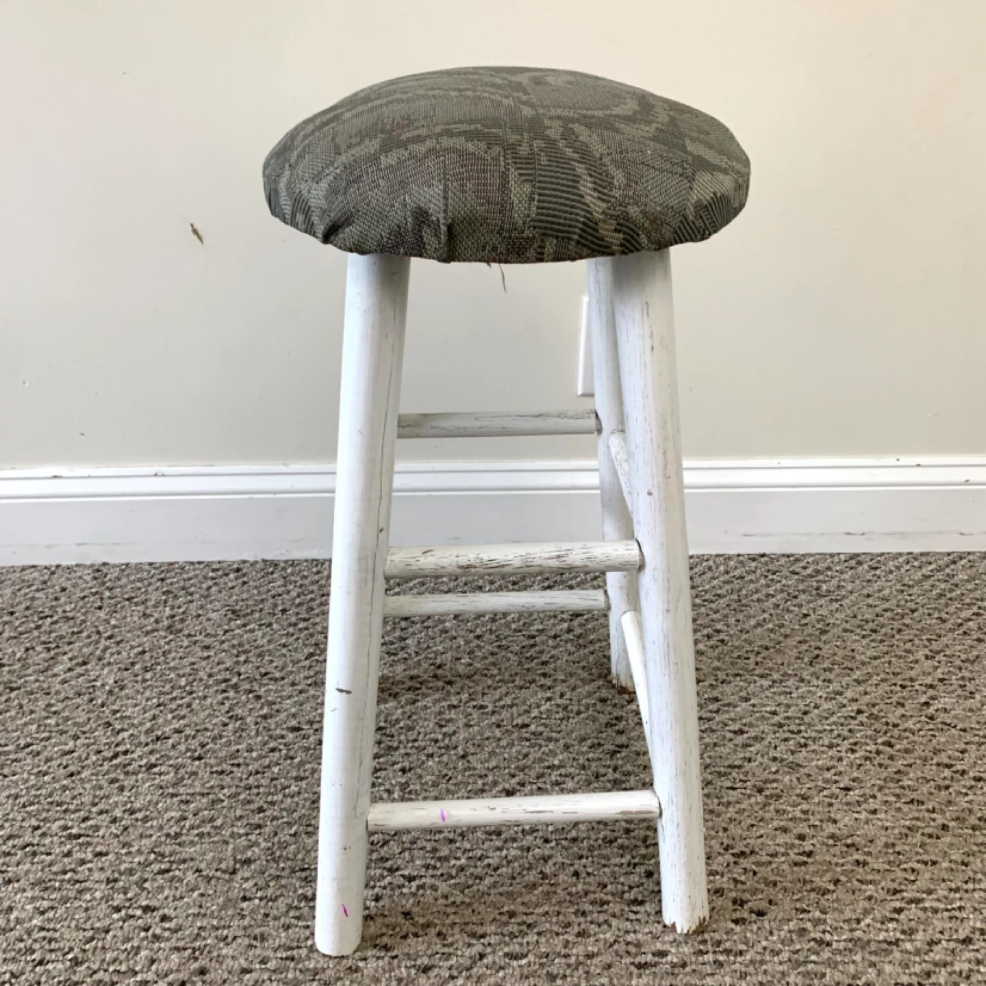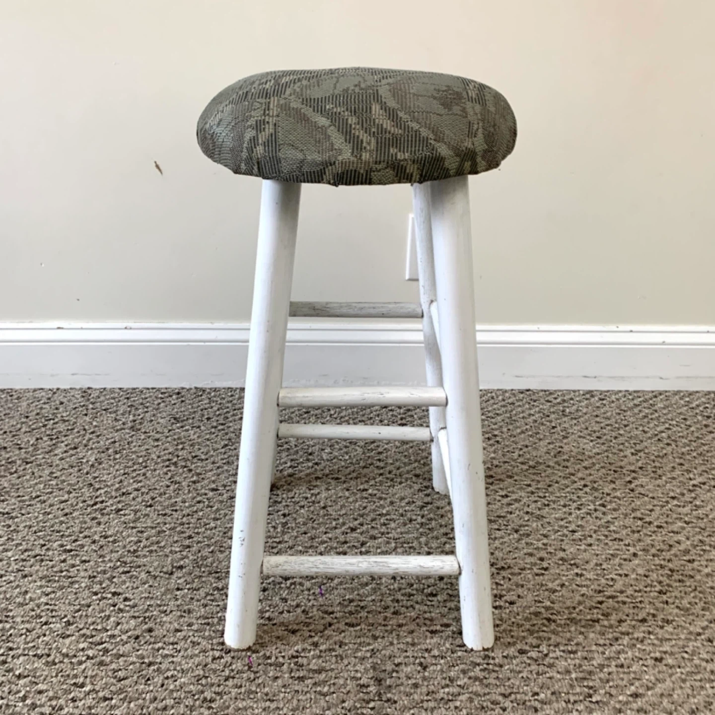 Bar stool upholstered seat counter chair with white wooden base and round cushioned seat perfect for kitchen island or bar counter. Grey and green patterned fabric adds a clean modern look while providing comfortable seating. Compact and practical for everyday use. Note: fair condition with visible wear, priced accordingly.