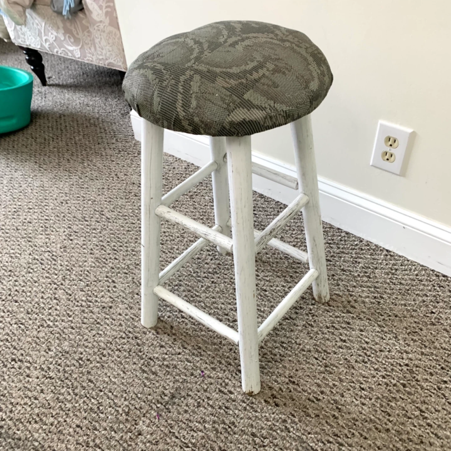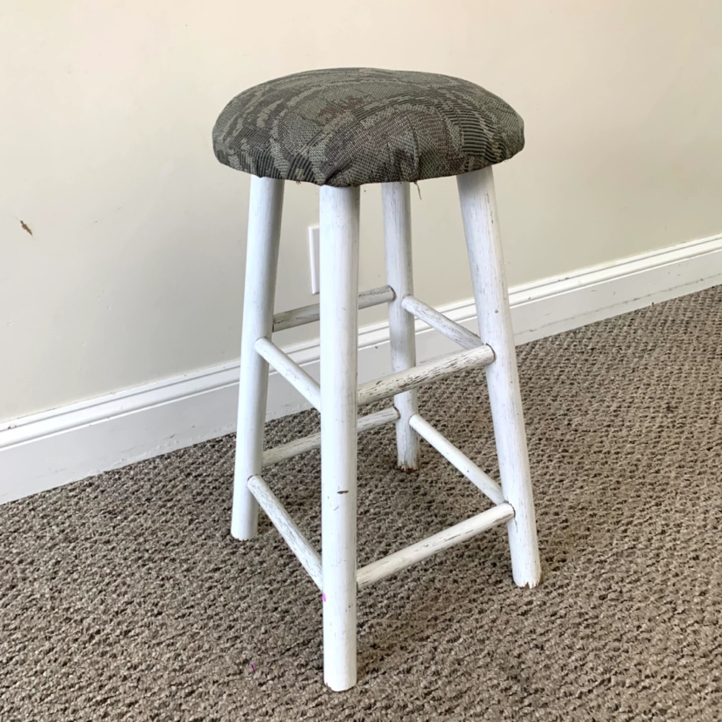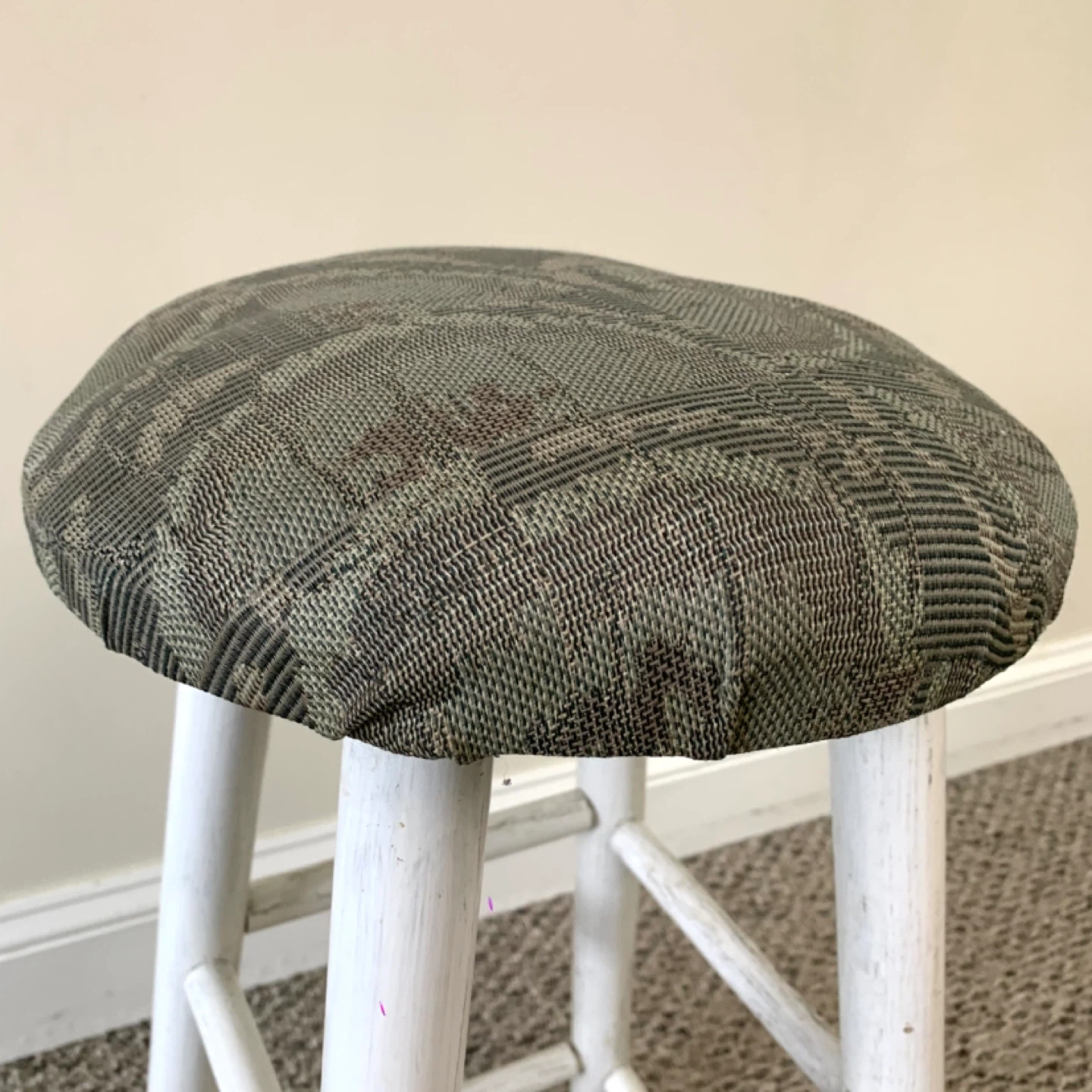 Bar stool upholstered seat counter chair with white wooden base and round cushioned seat perfect for kitchen island or bar counter. Grey and green patterned fabric adds a clean modern look while providing comfortable seating. Compact and practical for everyday use. Note: fair condition with visible wear, priced accordingly.