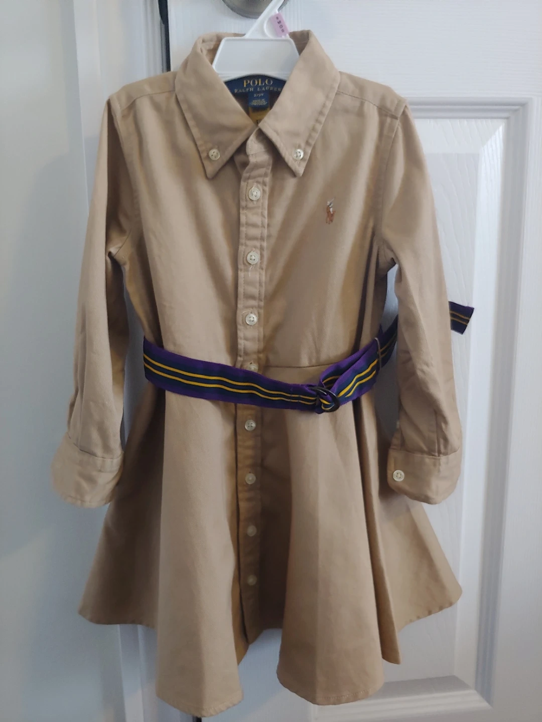 Classic Polo Ralph Lauren shirt dress is a khaki colour and comes with a striped belt. Made from cotton. It's a size 2/2T. Worn once for an hour, kept in the same beautiful condition, looks like new. Retails for $85.