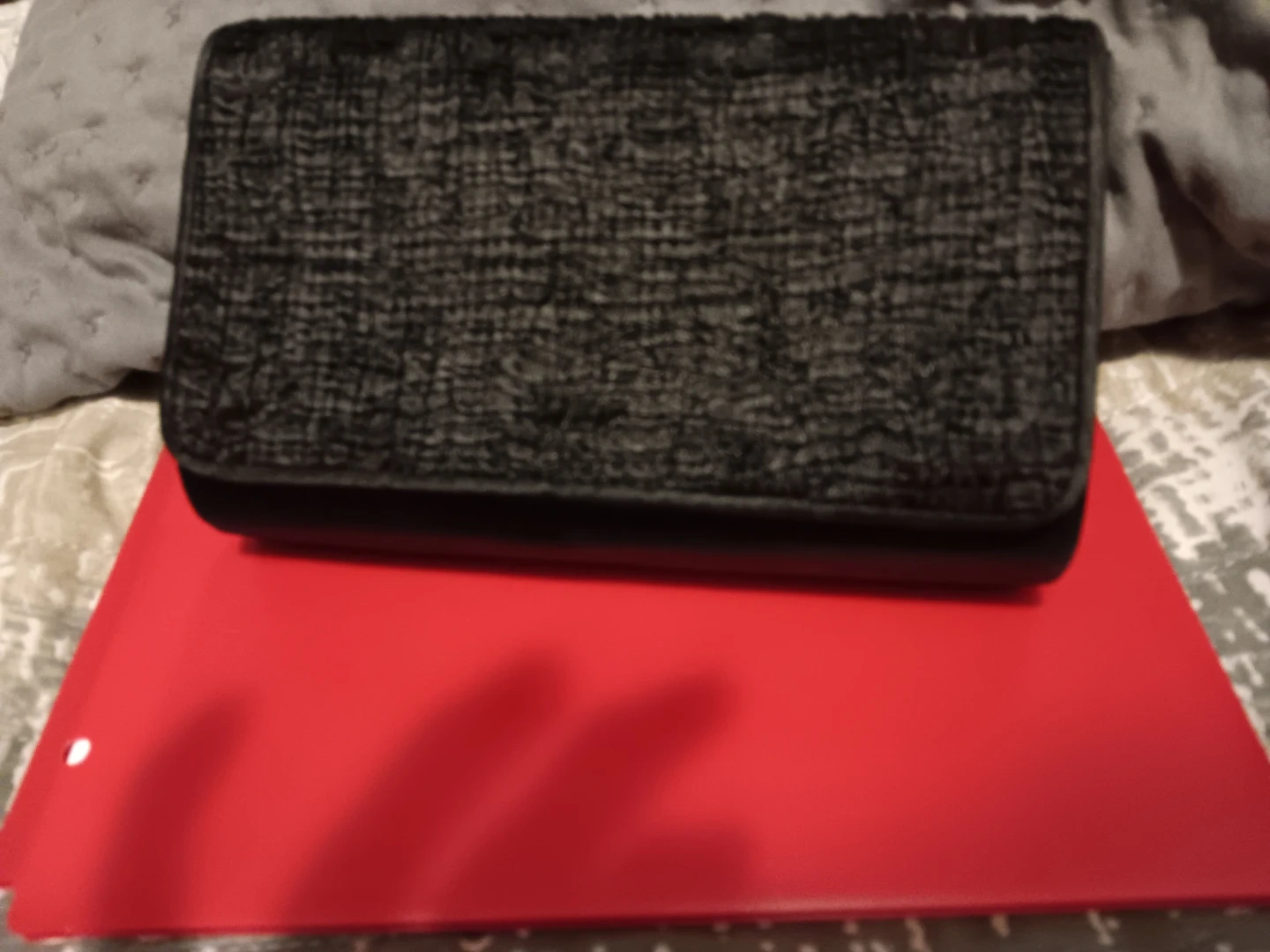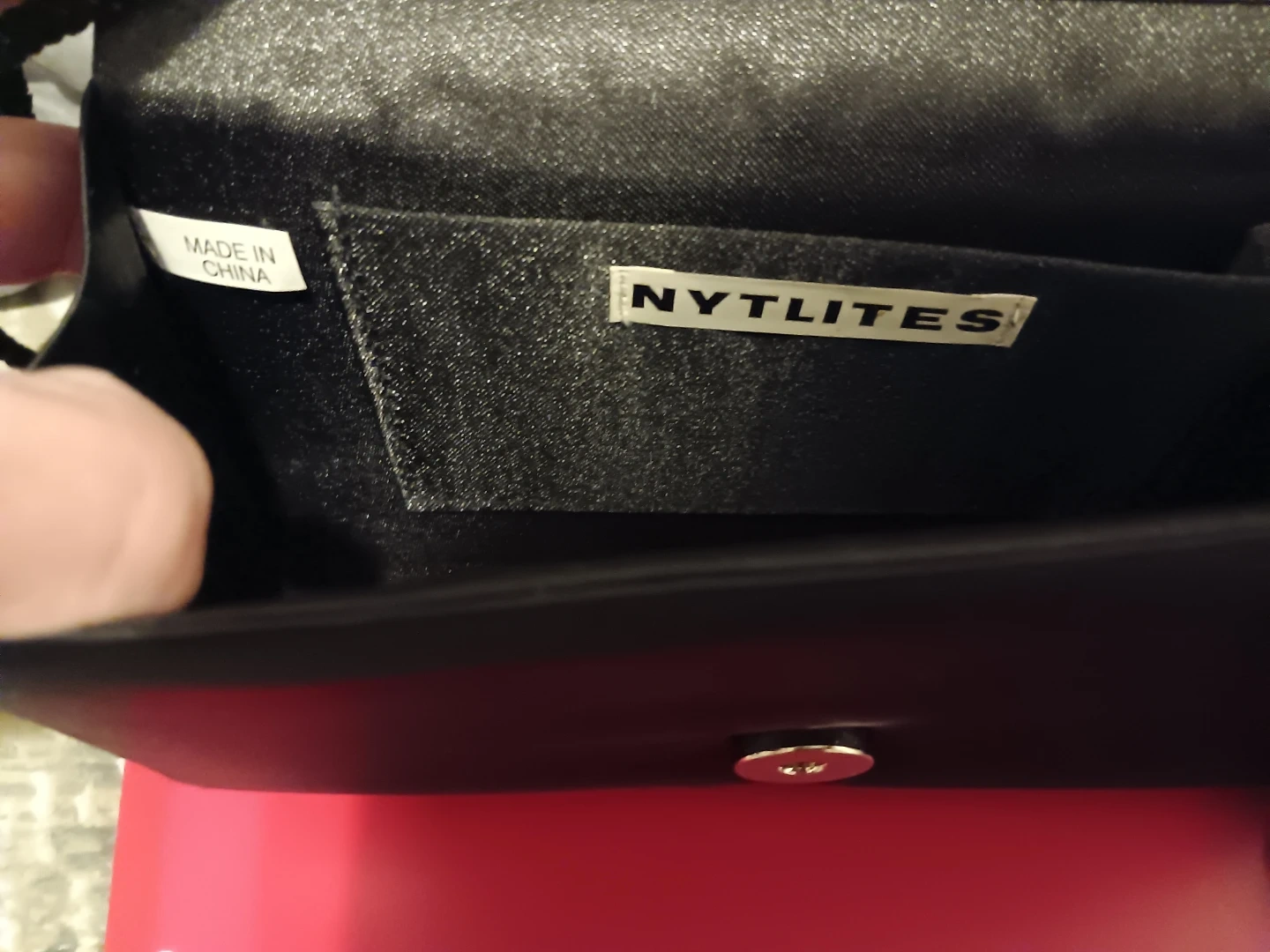 This Nytlites clutch purse is black and has a textured front. It's made in China. The interior features a small slip pocket.