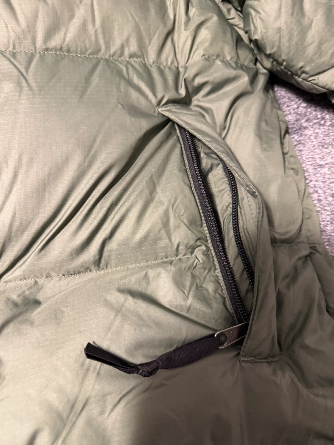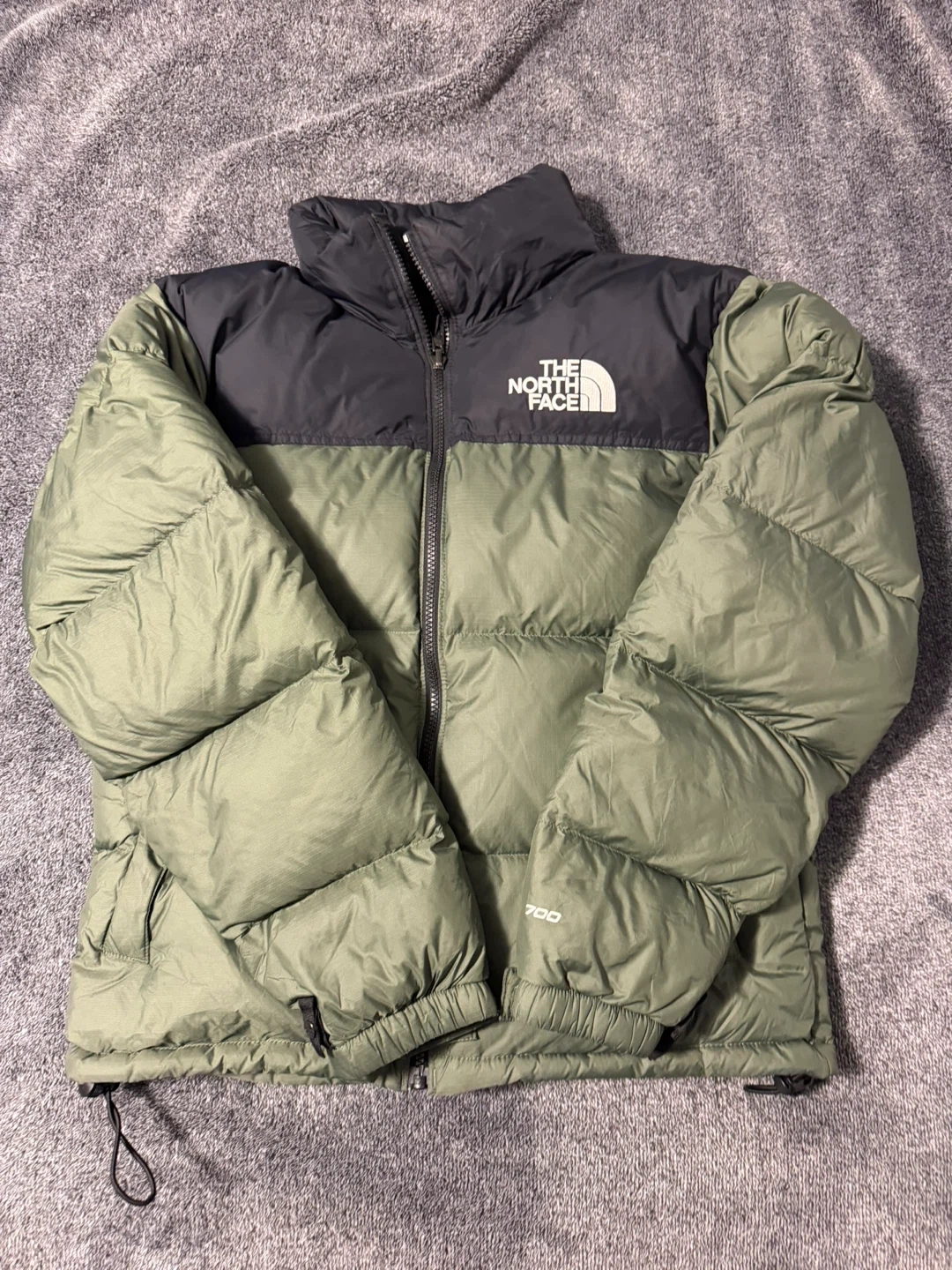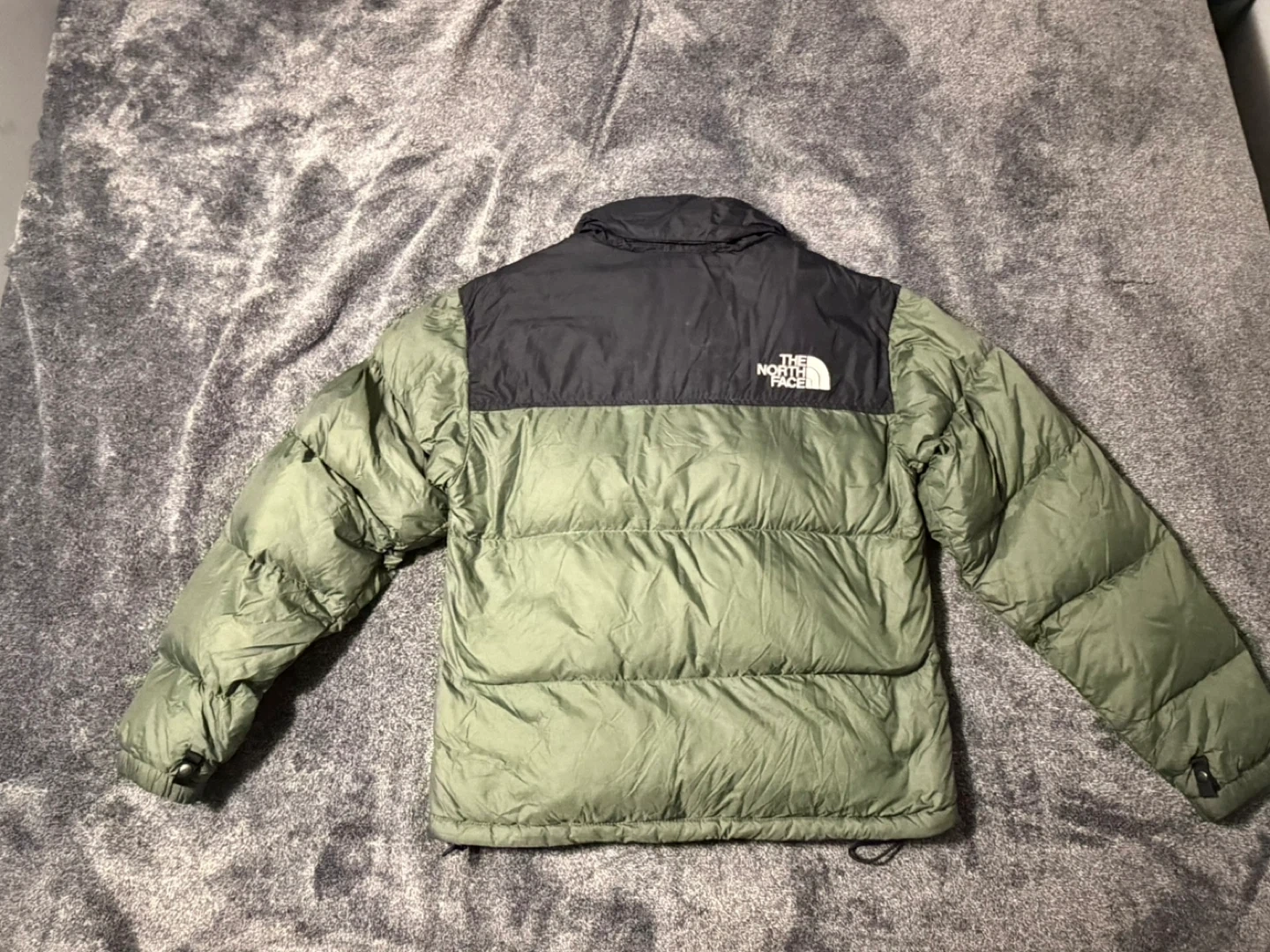 This is a green and black puffer jacket from The North Face. It's a men's XS size. The jacket has zippered pockets and a full zip front.