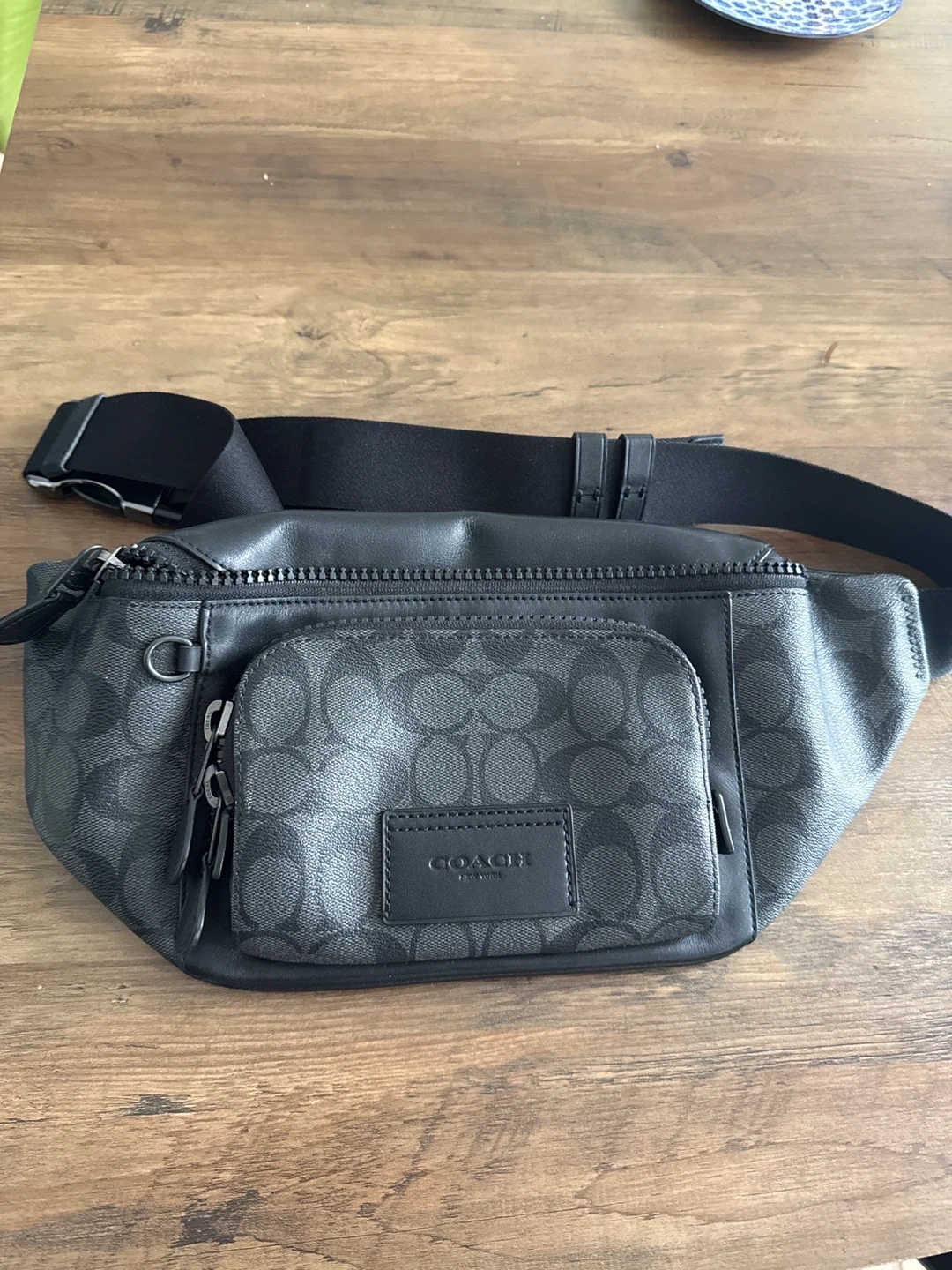 This is a Coach belt bag in signature canvas and black leather. It features a zippered main compartment and an exterior zippered pocket. The adjustable strap ensures a comfortable fit.