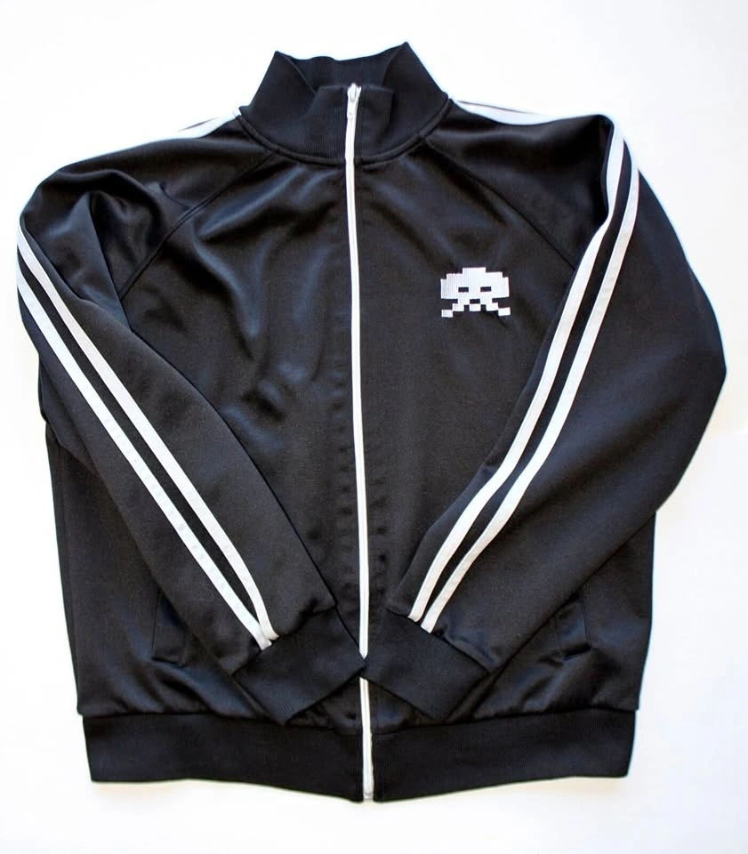 Super cool Space Invaders track jacket! The jacket is black, with light gray stripes on the sleeves, and light gray space invader characters. This item is pre-owned and shows some signs of use. There is minor pilling, some thread pulls/tugs, and a minor stain (please refer to the last few photos for these).