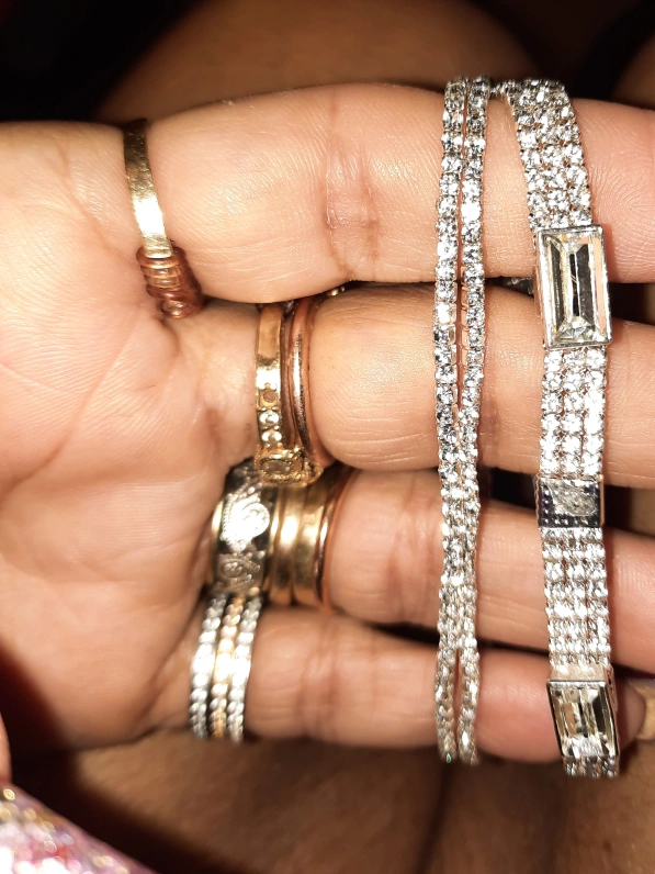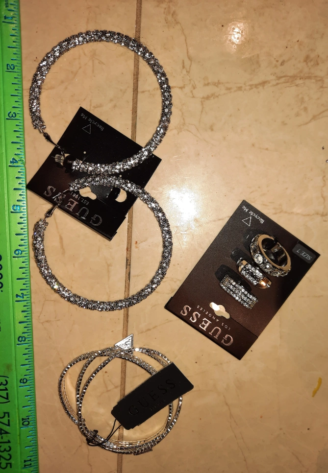Lot of women's GUESS jewelry. earrings Large HOOP earrings.Three pair rings sz 7 and lot of 3 Stretchy Rhinestone bracelets