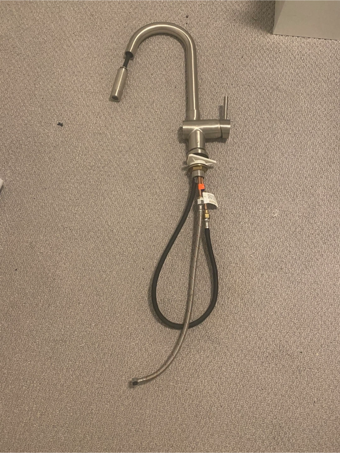 Brushed nickel finish pull-down kitchen faucet. It's made of stainless steel with a high-arc spout. Comes with flexible hoses for easy installation.
