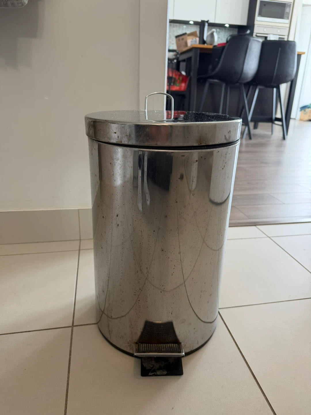 This is a stainless steel step trash can with a foot pedal. It's perfect for kitchens or bathrooms. It includes a removable inner bucket for easy cleaning.