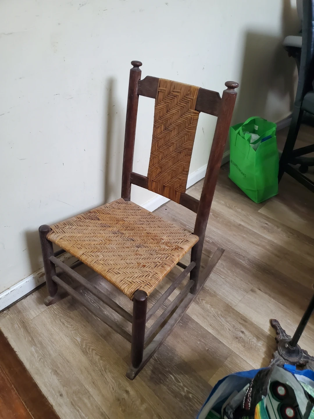 This is an Old Hickory chair. It's made of wood and woven material. The chair has a classic design and would make a nice addition to a rustic or farmhouse decor.