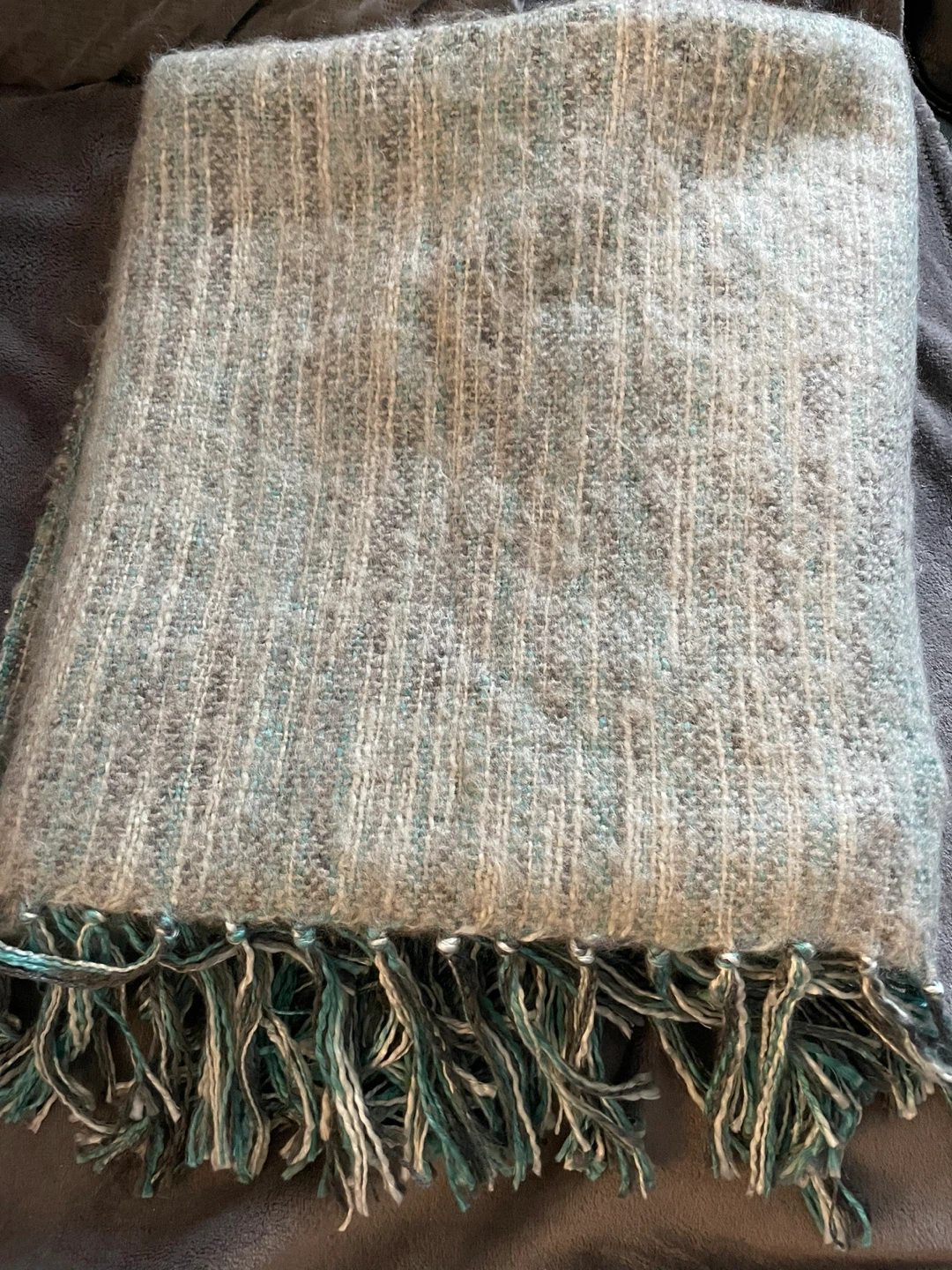 It's a blend of grey, white, and teal colours with fringed edges.