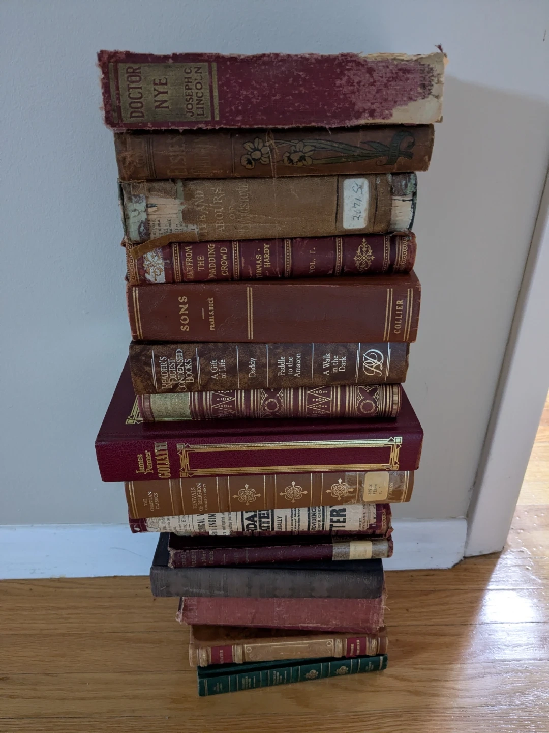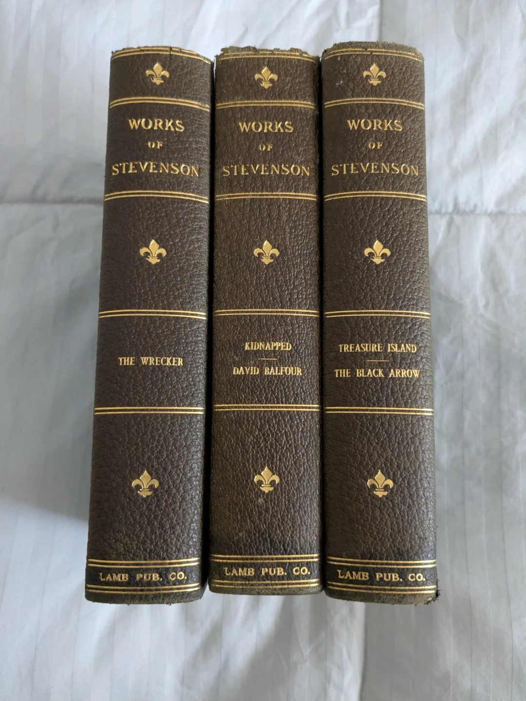 This is a collection of assorted vintage/leather bound books.in varying conditions but they are all old and show their age. Was collecting these kinds of books for an old library display but I've developed dust allergies. Pickup only. Price is for all books, can sell individually for 5 each (Robert Louis Stevenson set only selling together for 30).