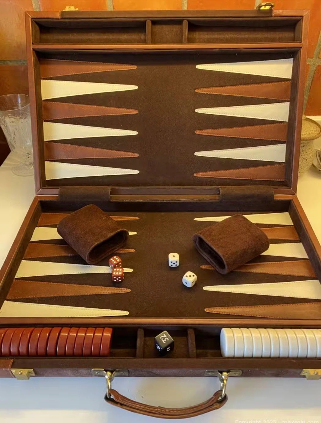 Classic backgammon set in a compact, briefcase-style case. It's made with a combination of soft brown suede and rich leather. Includes checkers, dice, and a doubling cube.